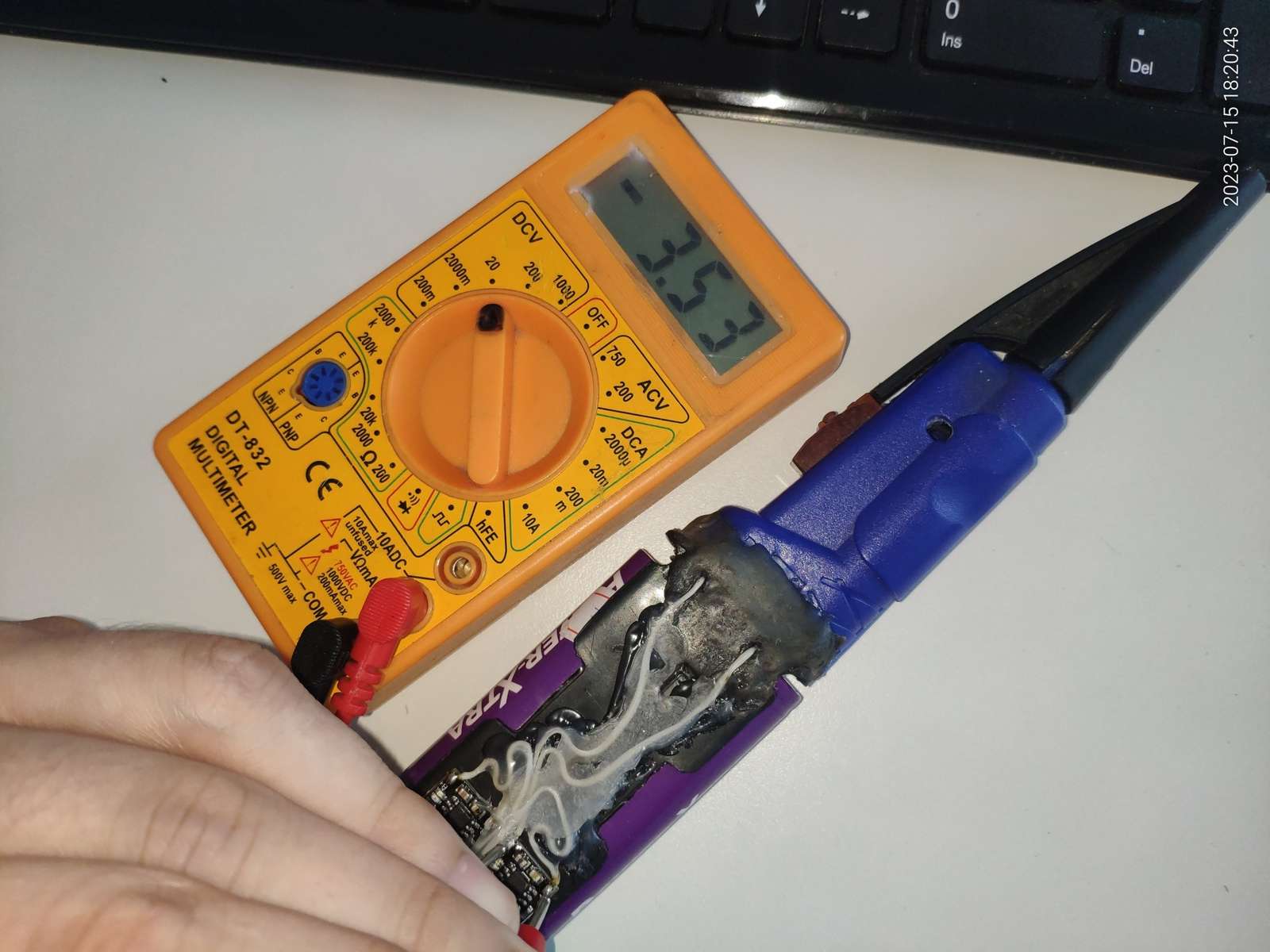 Отпаиваю защиту, проверяю состояние аккумулятора, хм, напряжение всего 2.69в, сойдёт: