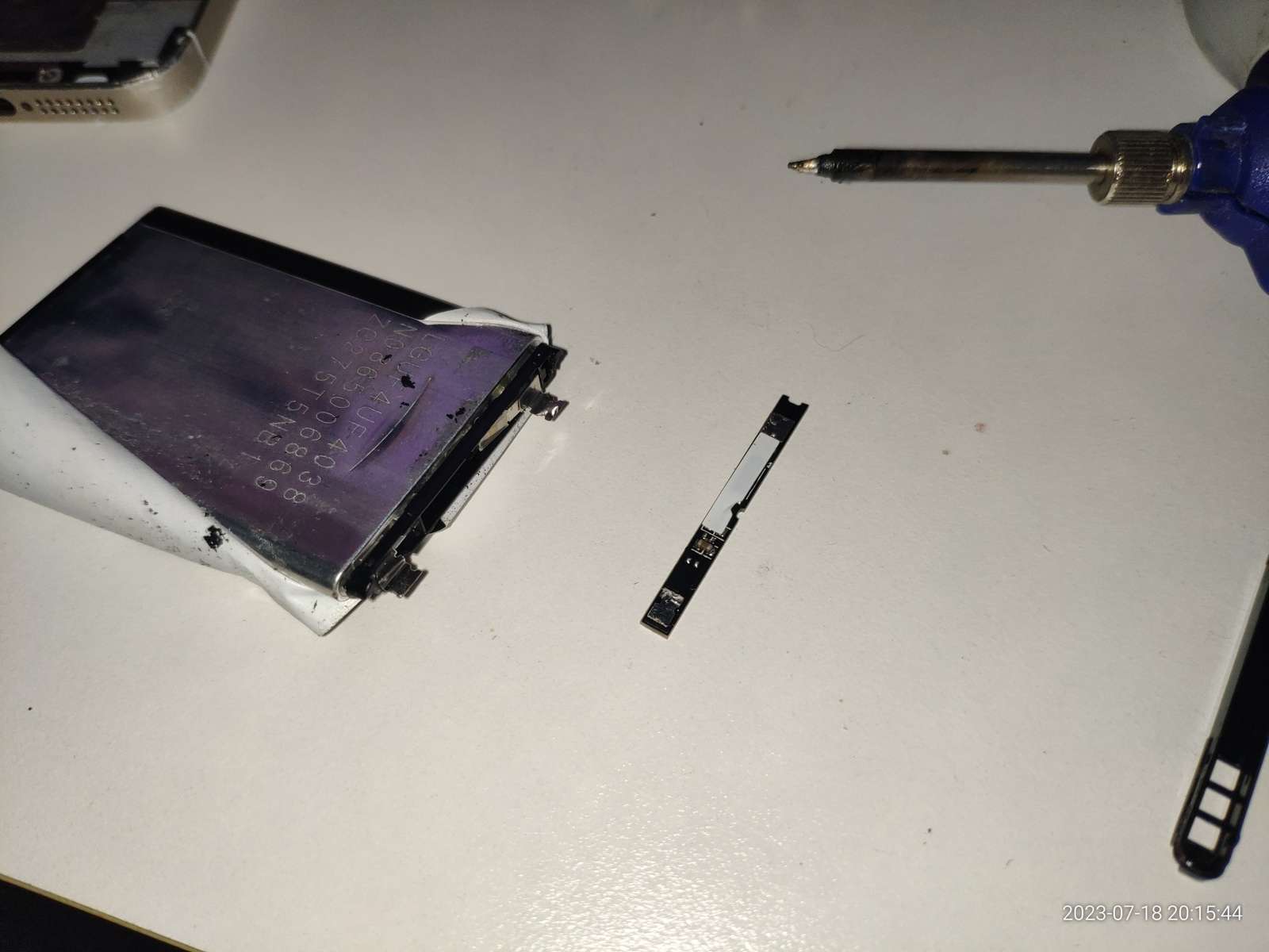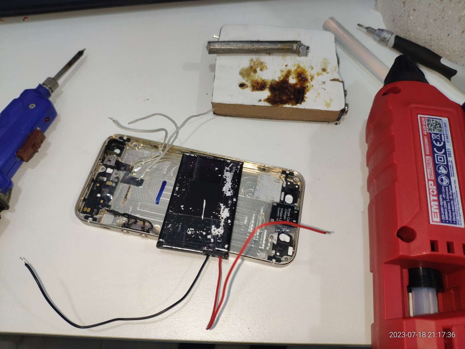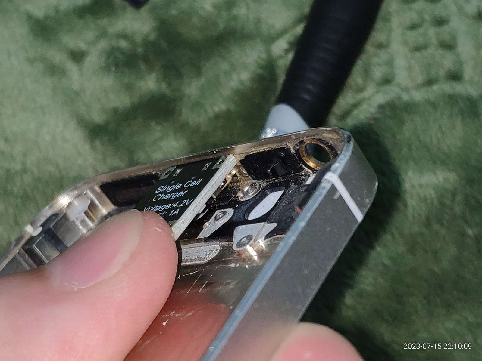 Для безопасного длительного хранения я хотел встроить выключатель полностью отключающий аккумулятор от цепи, и даже умудрился разобрать и переделать родной выключатель от iPhone, но одна деталь выключателя была потеряна в процессе работ, в общем не задалось: