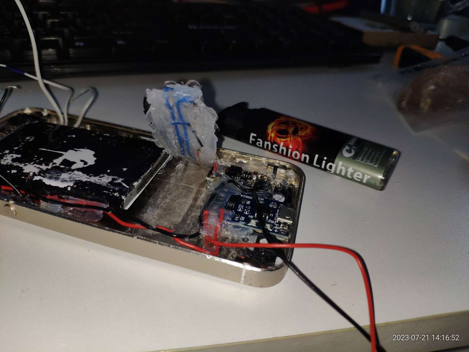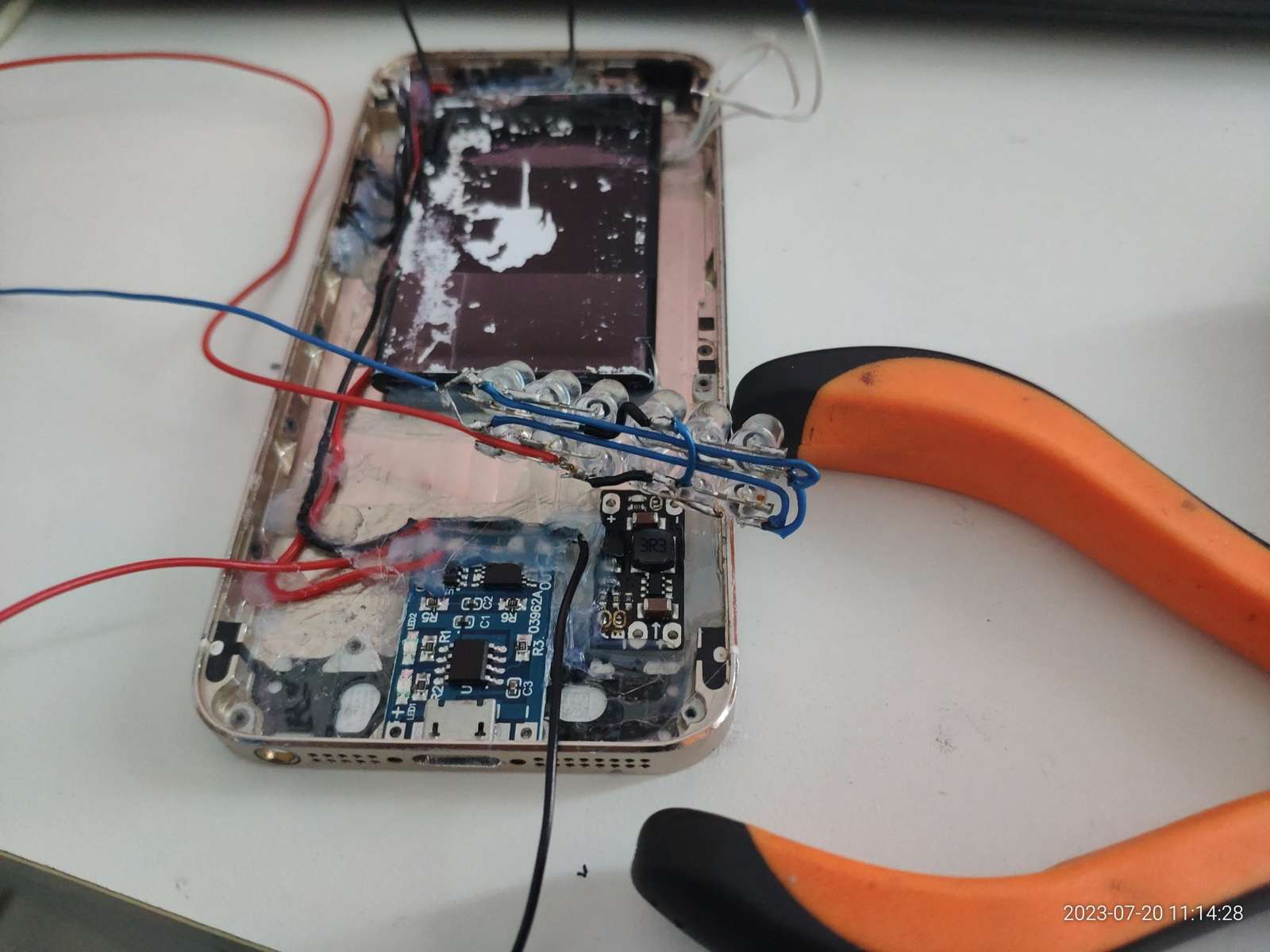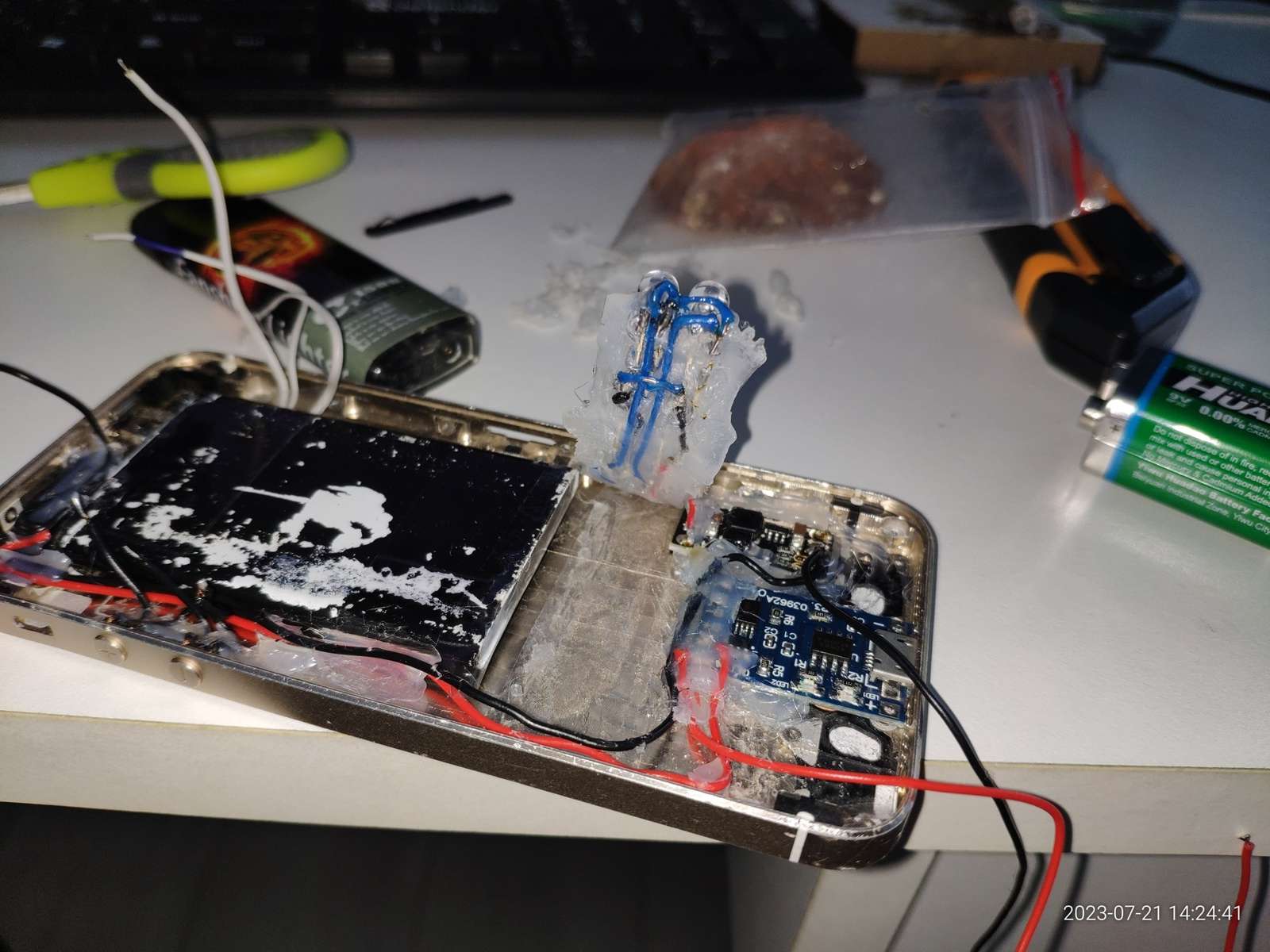 Для безопасного длительного хранения я хотел встроить выключатель полностью отключающий аккумулятор от цепи, и даже умудрился разобрать и переделать родной выключатель от iPhone, но одна деталь выключателя была потеряна в процессе работ, в общем не задалось: