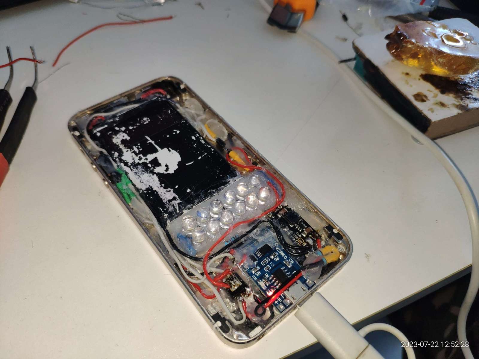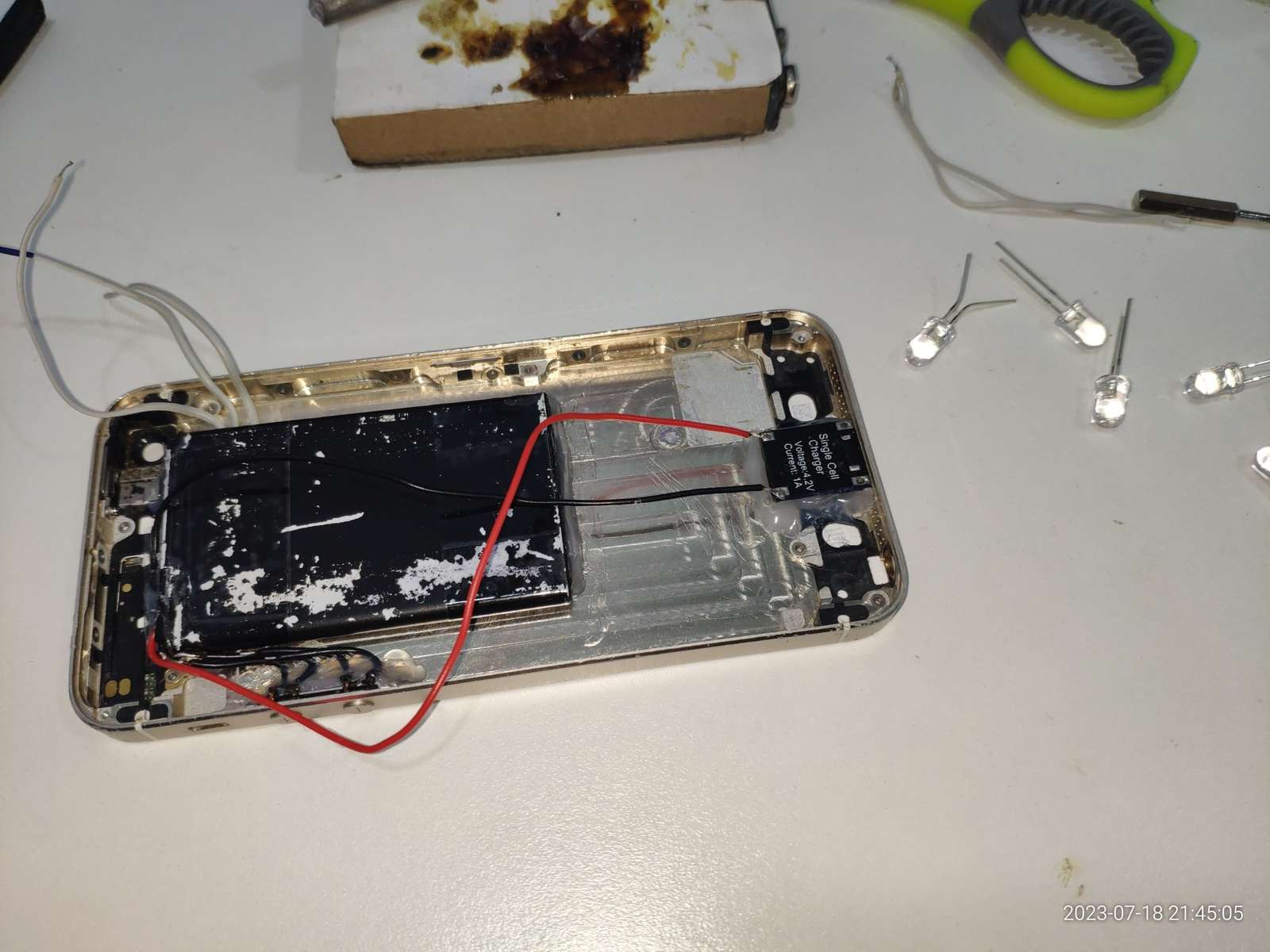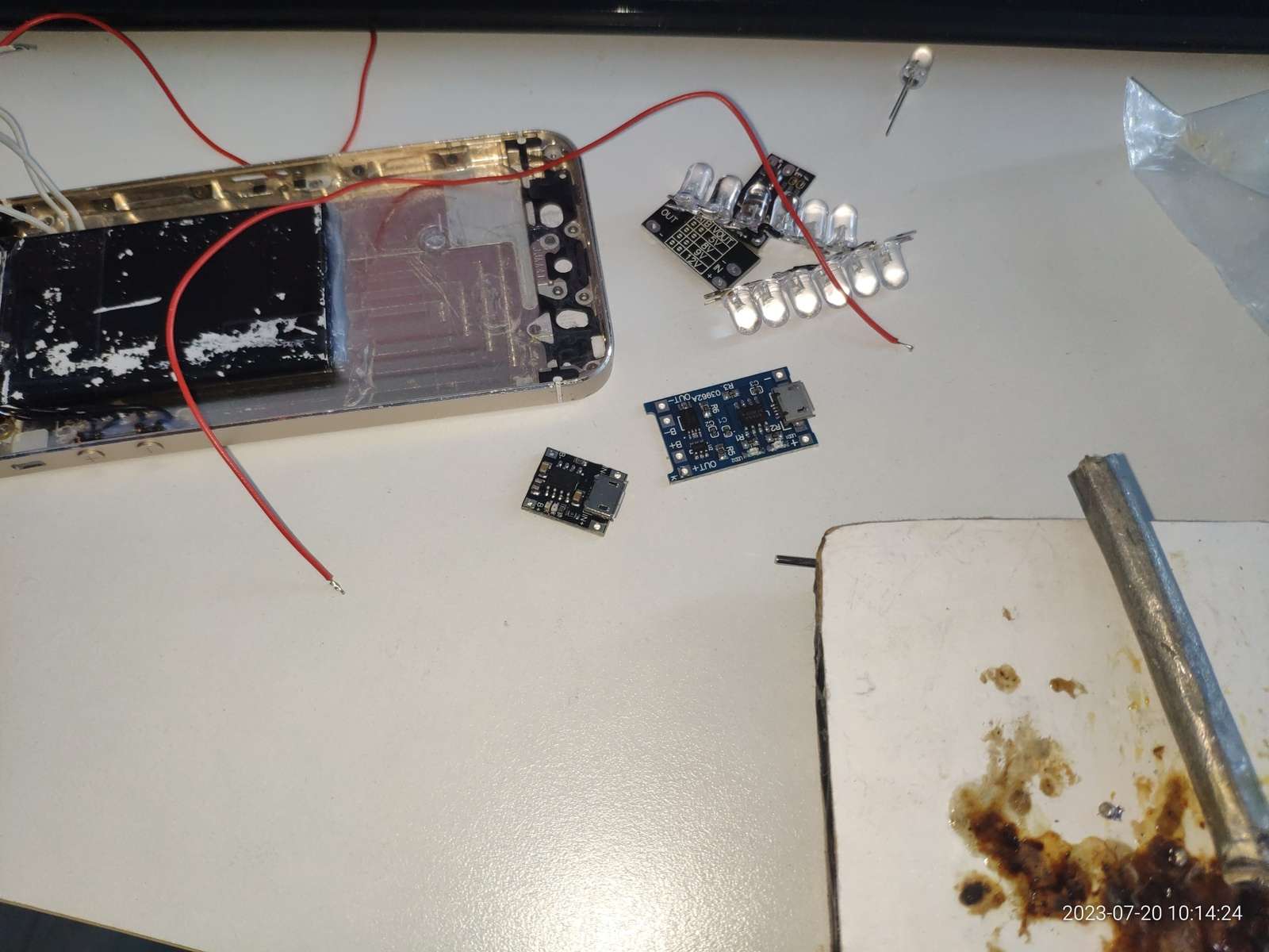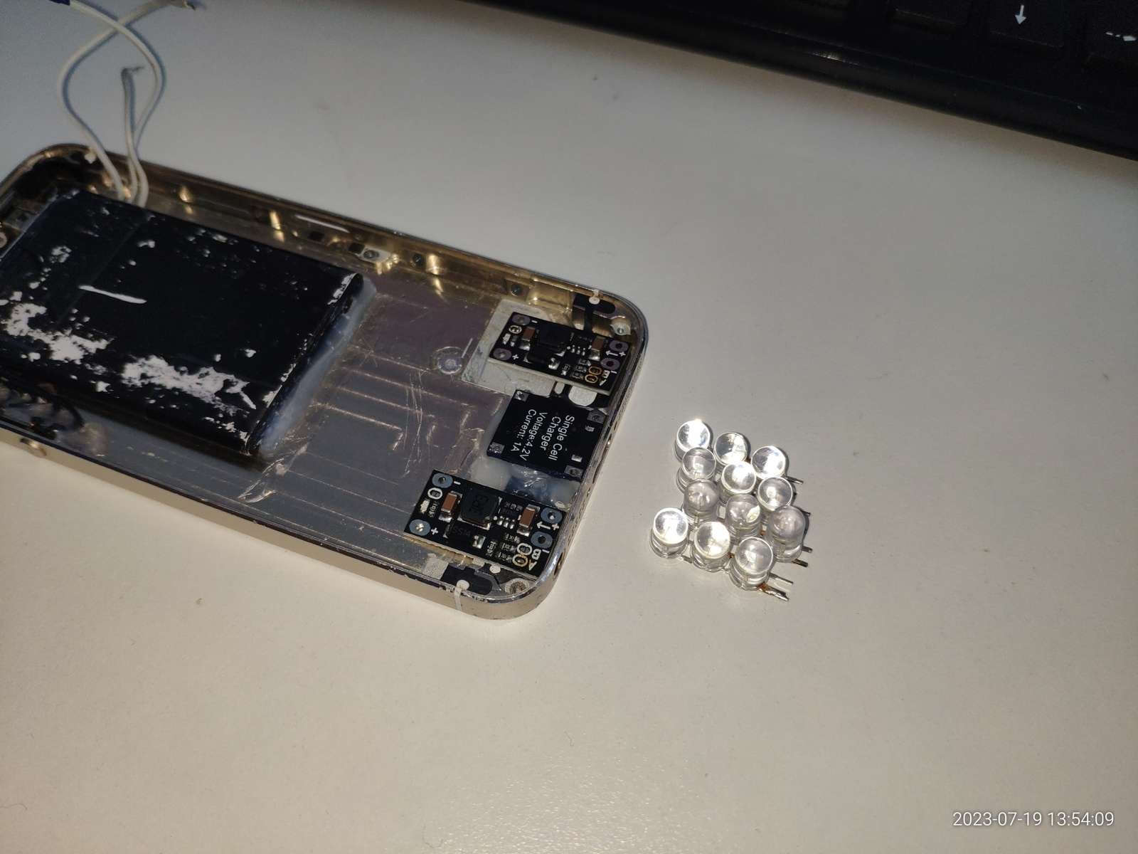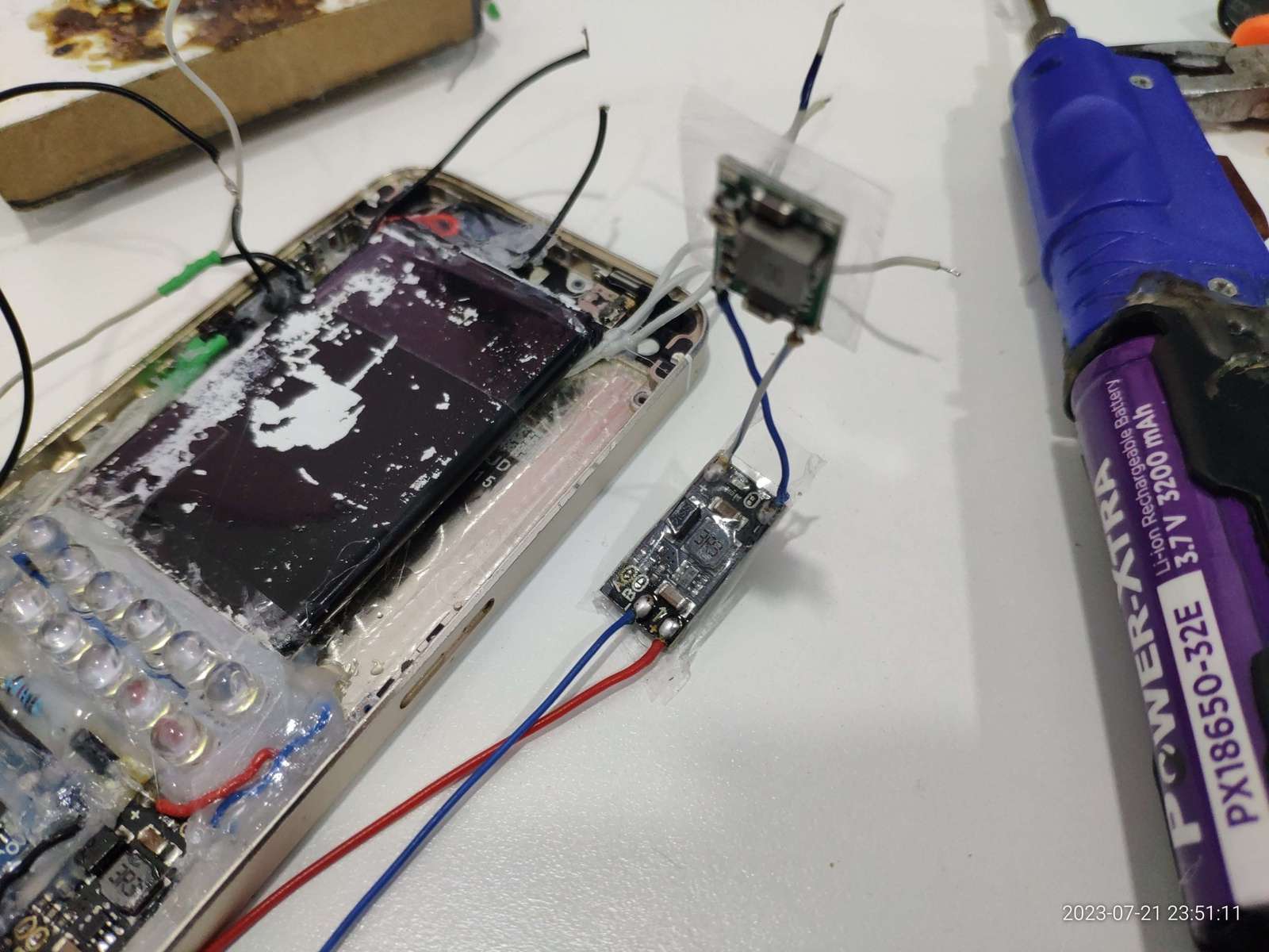 Далее мне нужно было подключить светодиоды встроенной вспышки, пытался химичить с помощью китайского понижающего модуля, но он никак не хотел работать от низкого напряжения одного аккумулятора, в итоге я другим модулем повышал напряжение, но понижающий модуль всё равно работал неадекватно, и я в итоге спалил один светодиод тёплого свечения, на этом было решено выбросить хлам из конструкции: