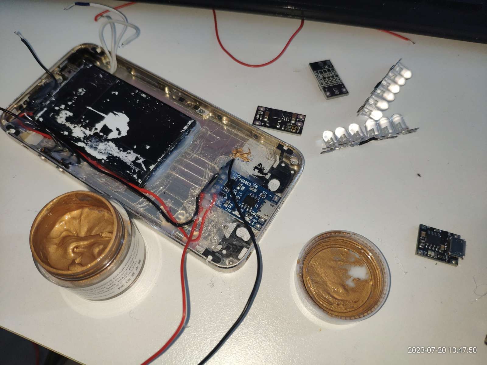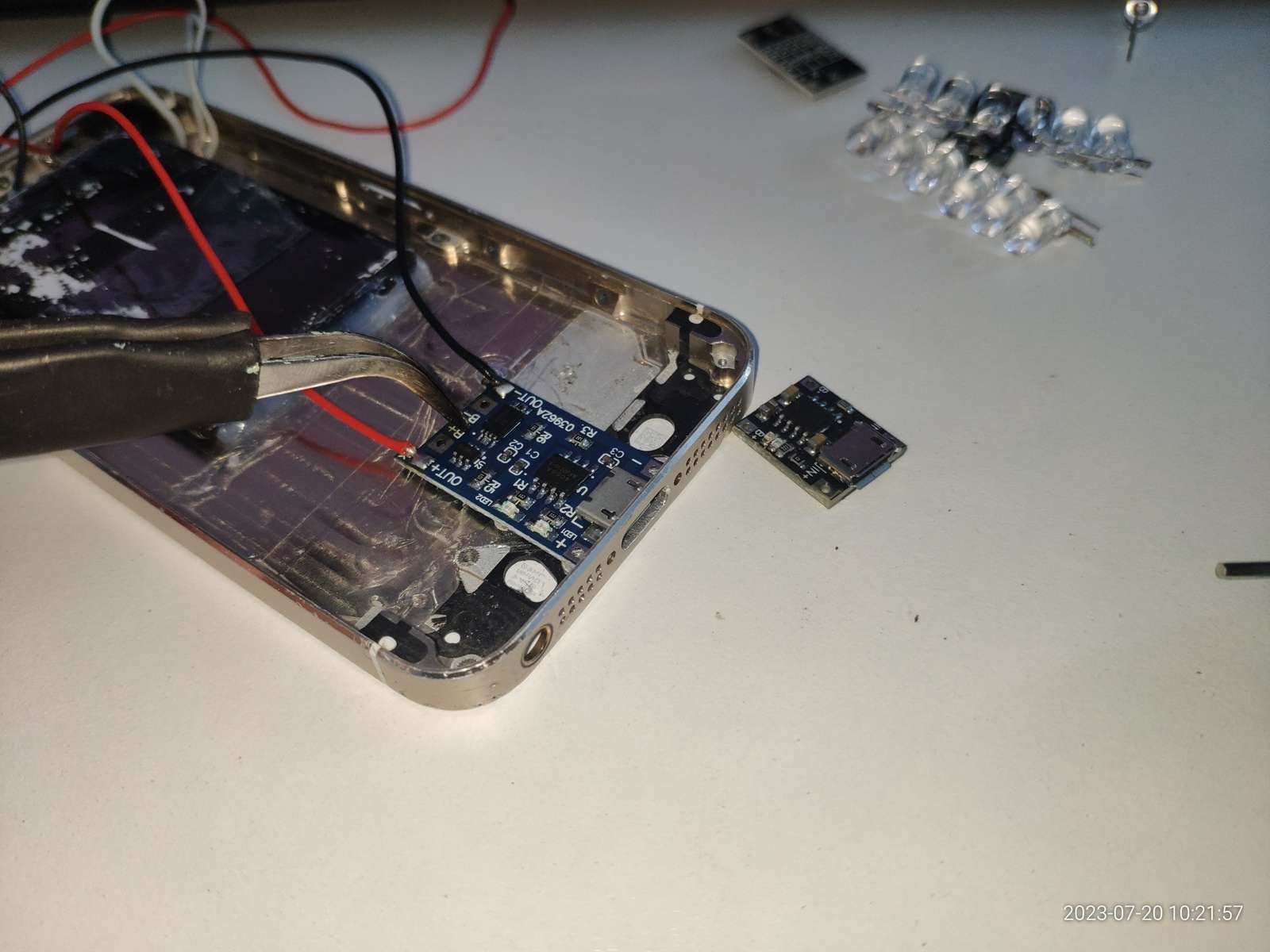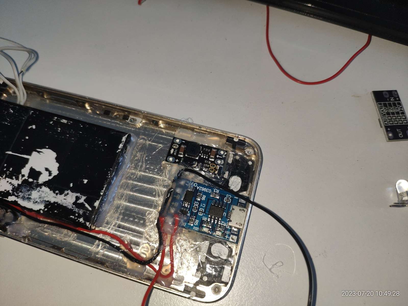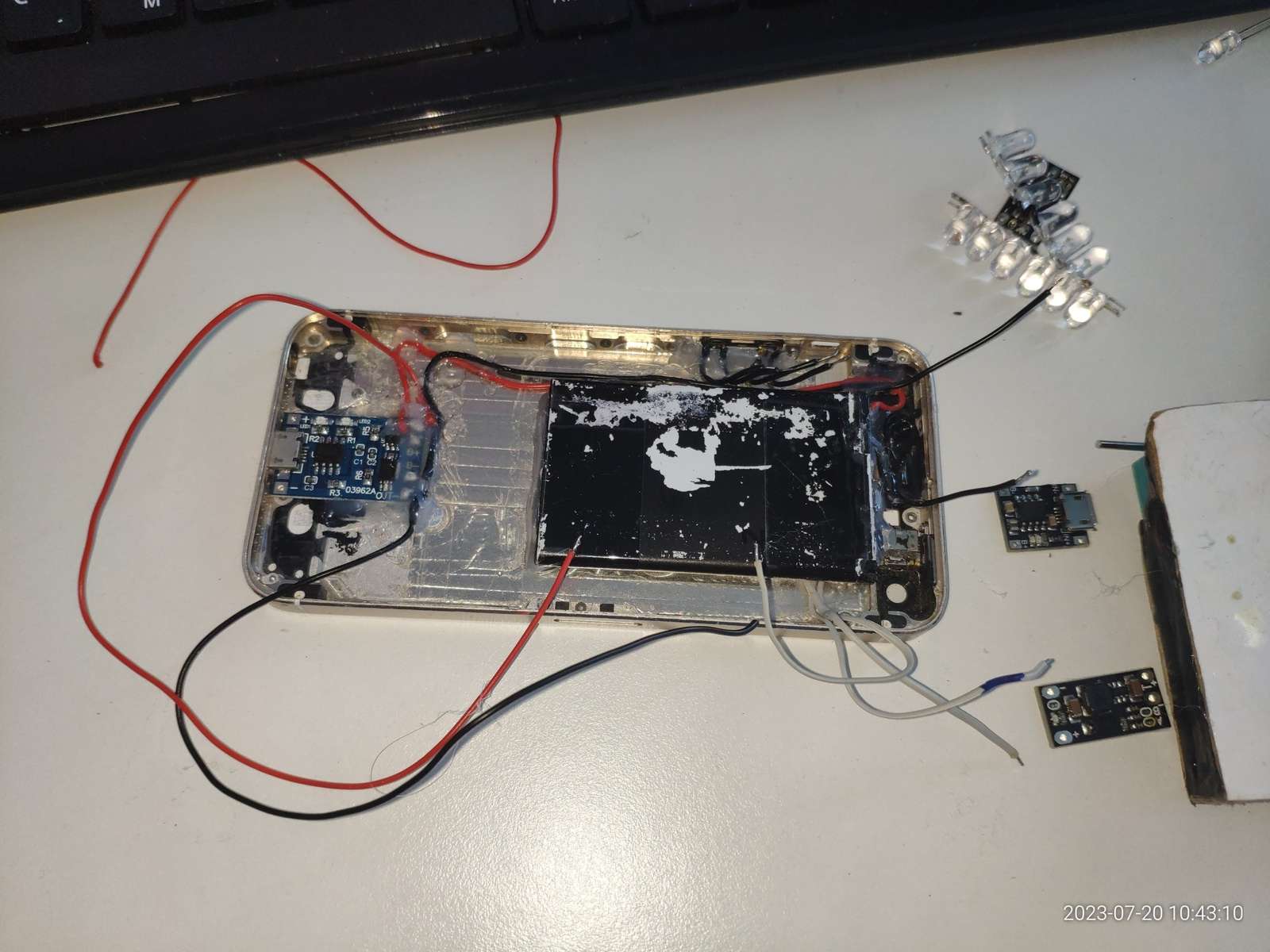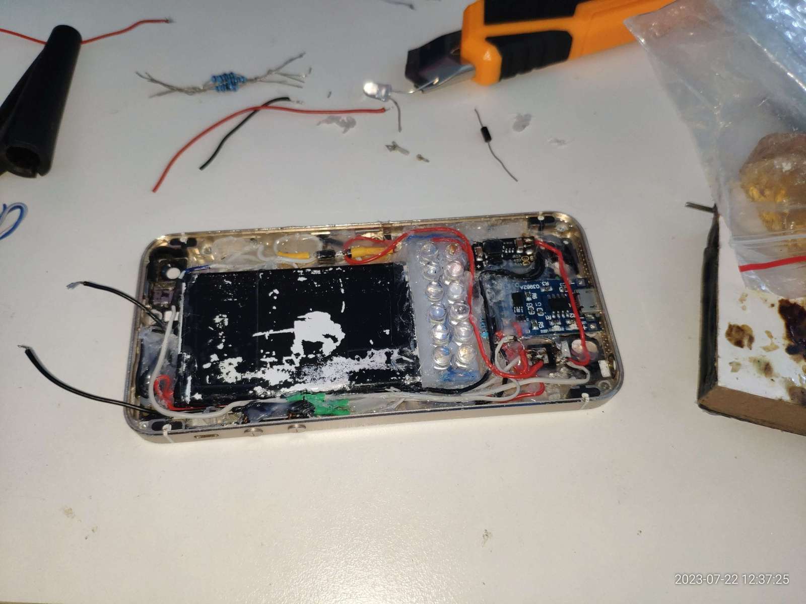 Далее мне нужно было подключить светодиоды встроенной вспышки, пытался химичить с помощью китайского понижающего модуля, но он никак не хотел работать от низкого напряжения одного аккумулятора, в итоге я другим модулем повышал напряжение, но понижающий модуль всё равно работал неадекватно, и я в итоге спалил один светодиод тёплого свечения, на этом было решено выбросить хлам из конструкции: