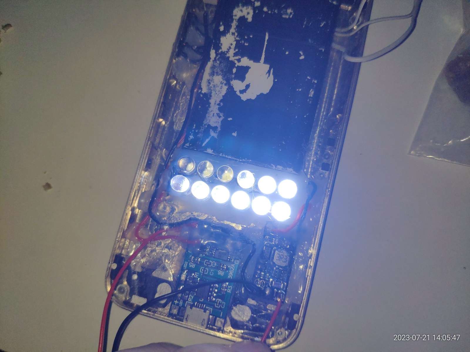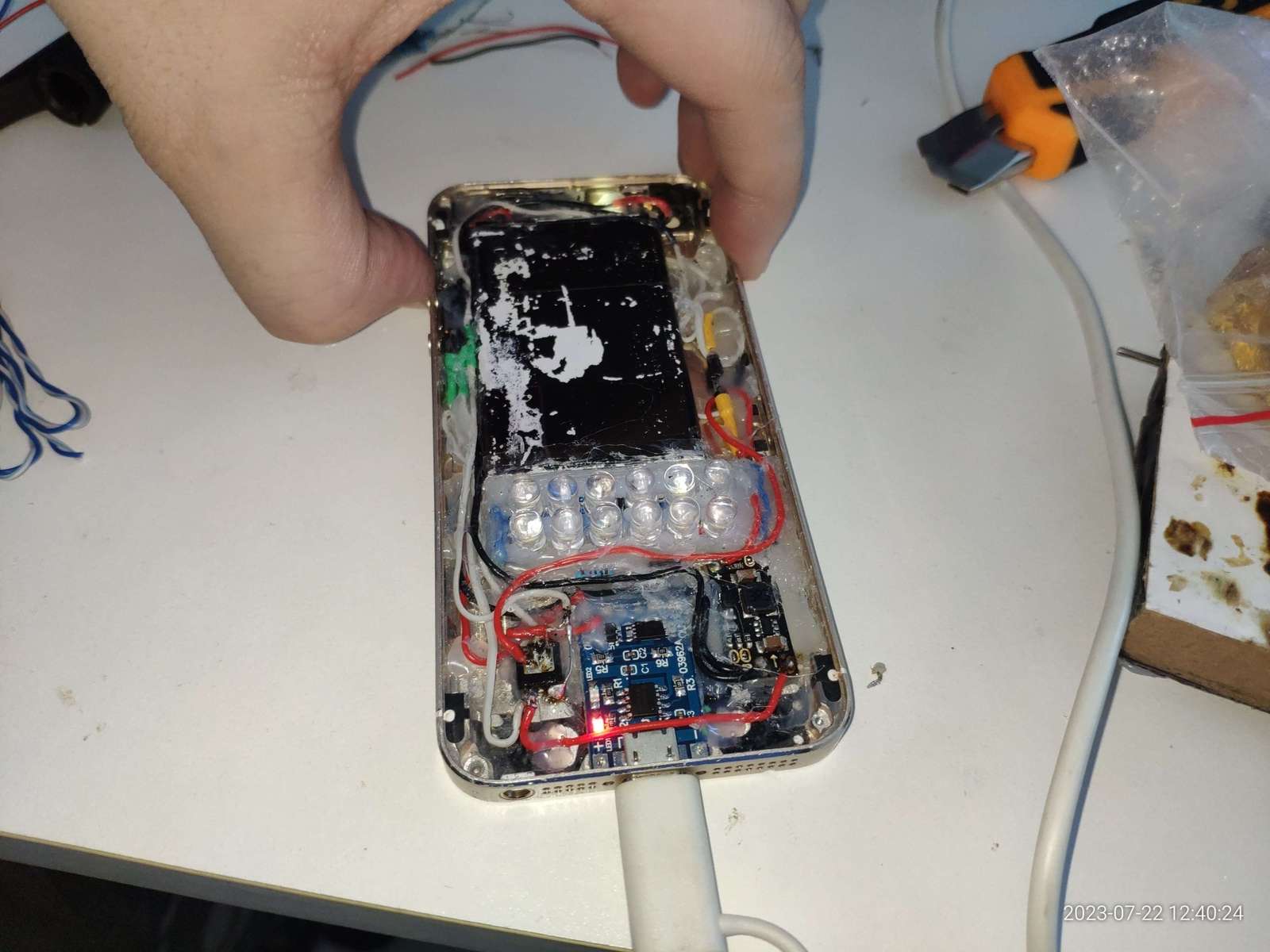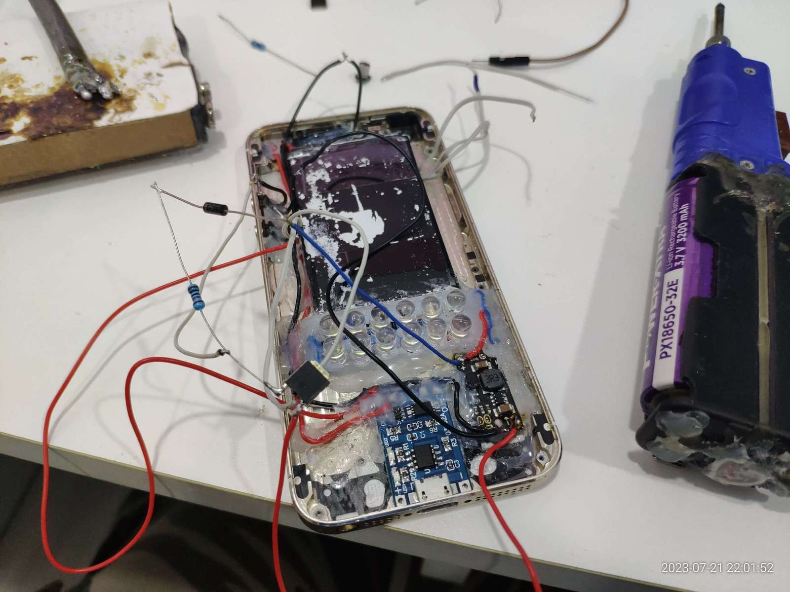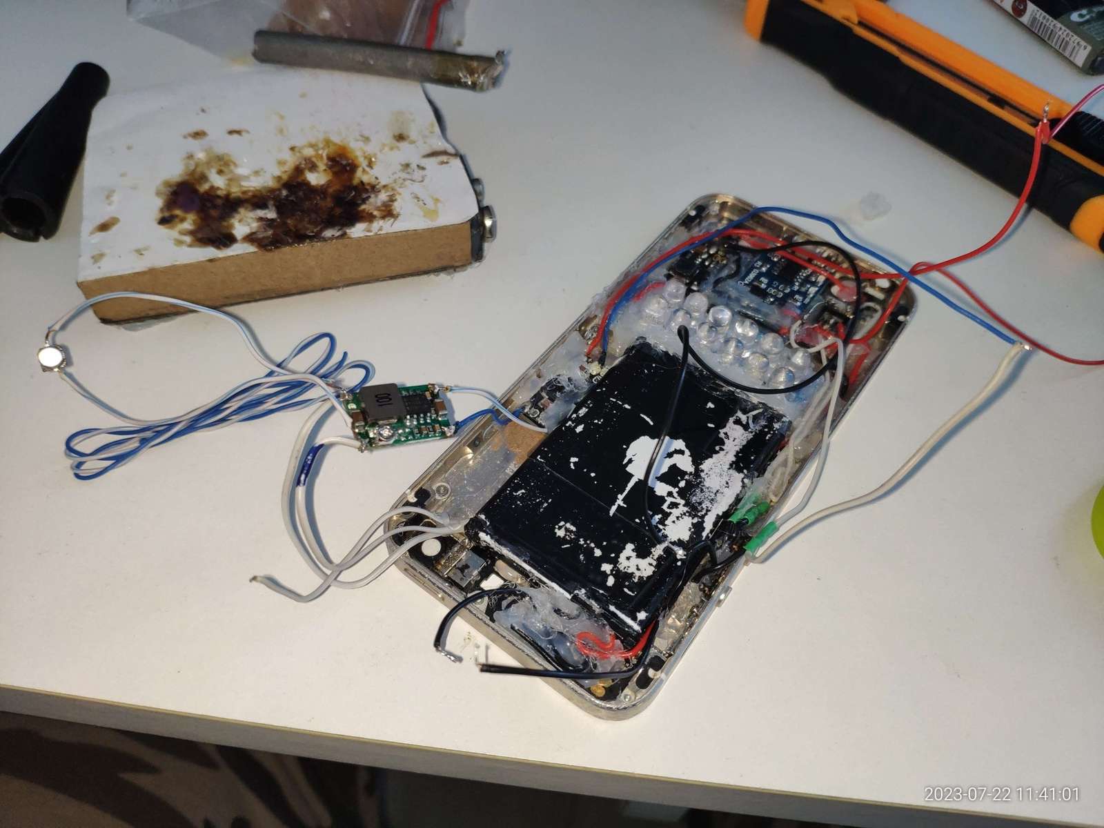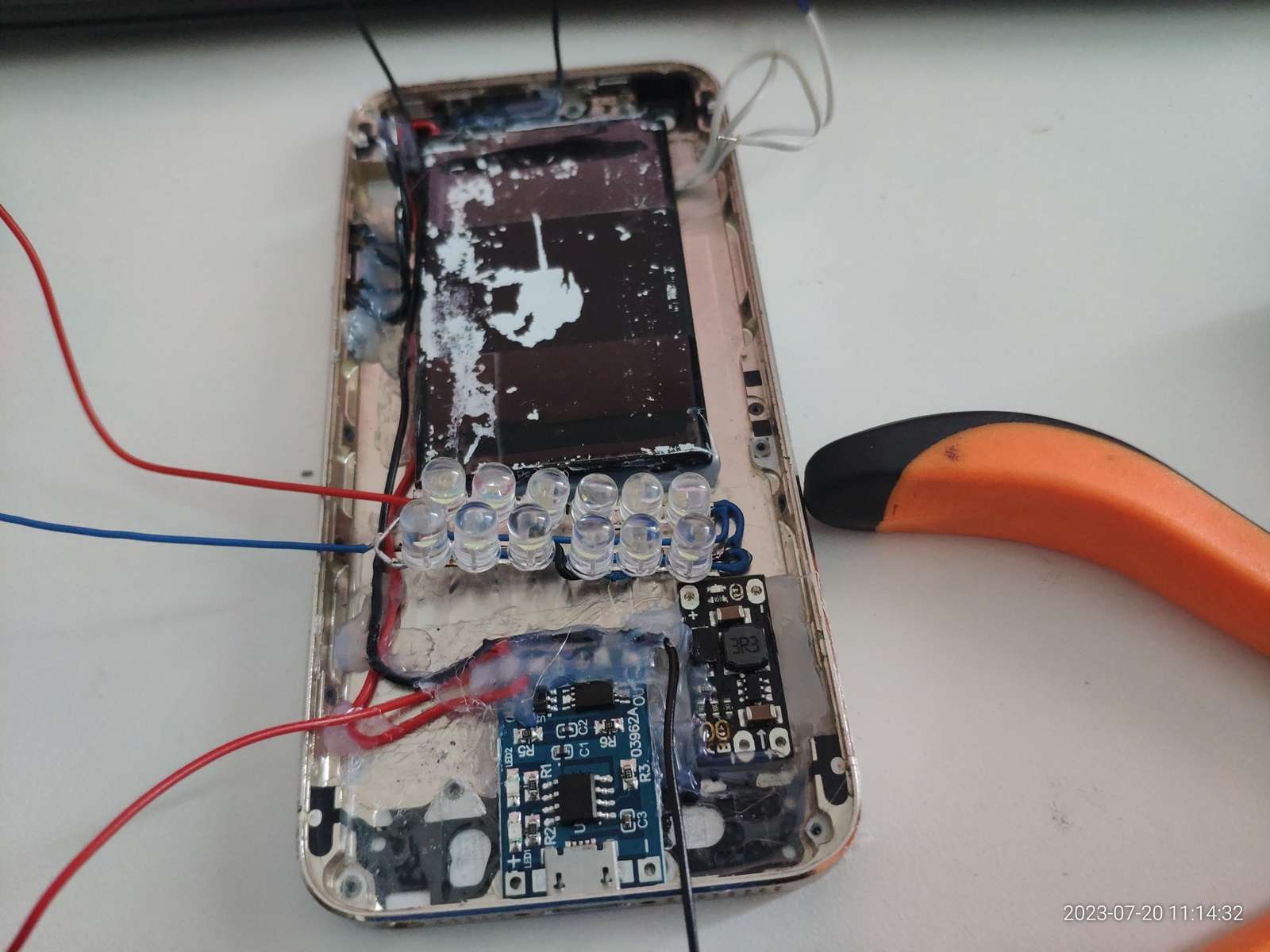 Далее мне нужно было подключить светодиоды встроенной вспышки, пытался химичить с помощью китайского понижающего модуля, но он никак не хотел работать от низкого напряжения одного аккумулятора, в итоге я другим модулем повышал напряжение, но понижающий модуль всё равно работал неадекватно, и я в итоге спалил один светодиод тёплого свечения, на этом было решено выбросить хлам из конструкции: