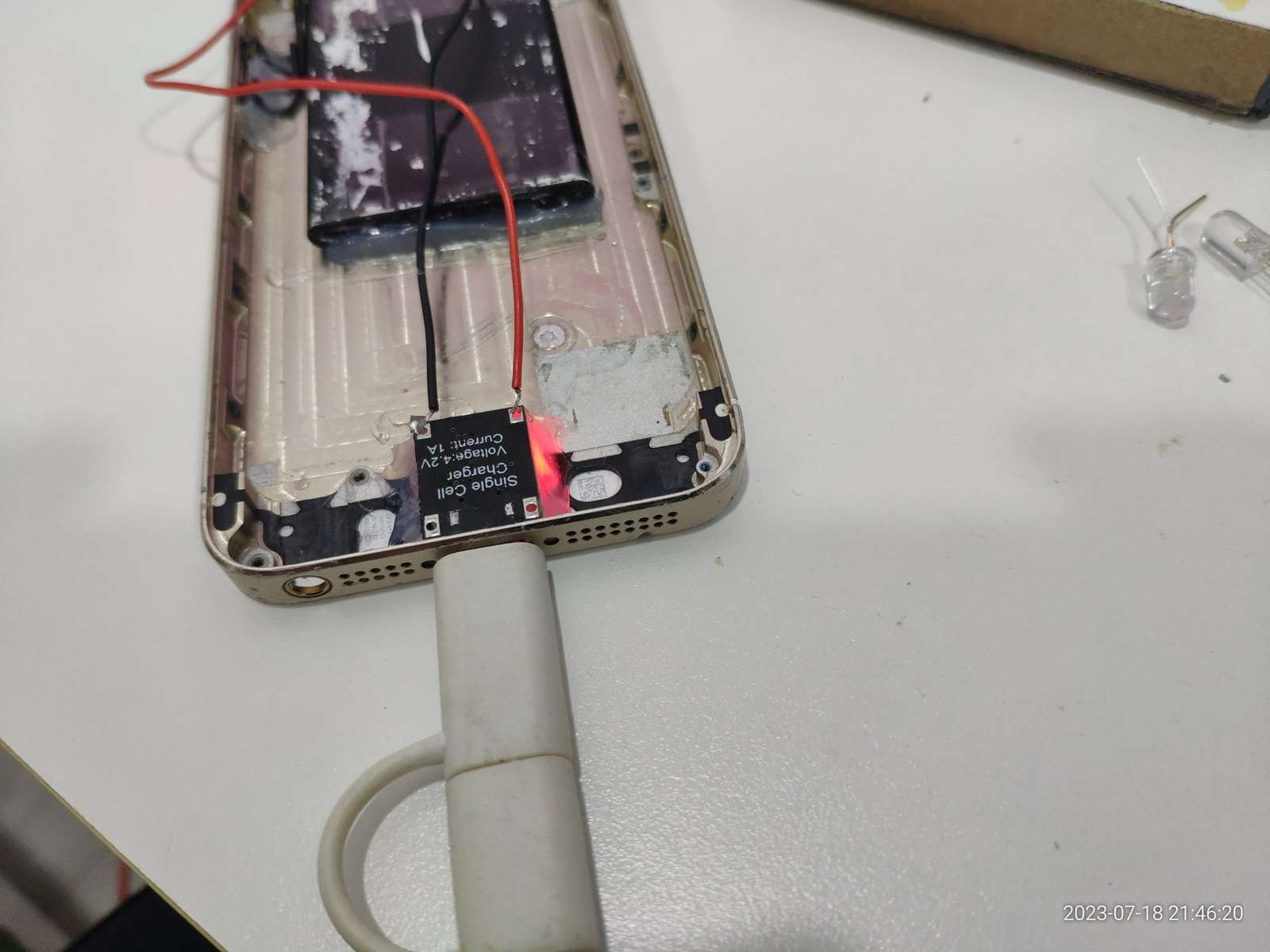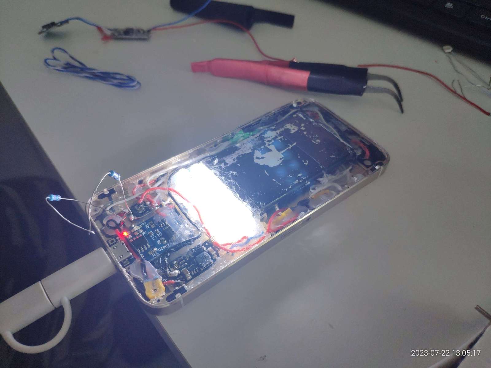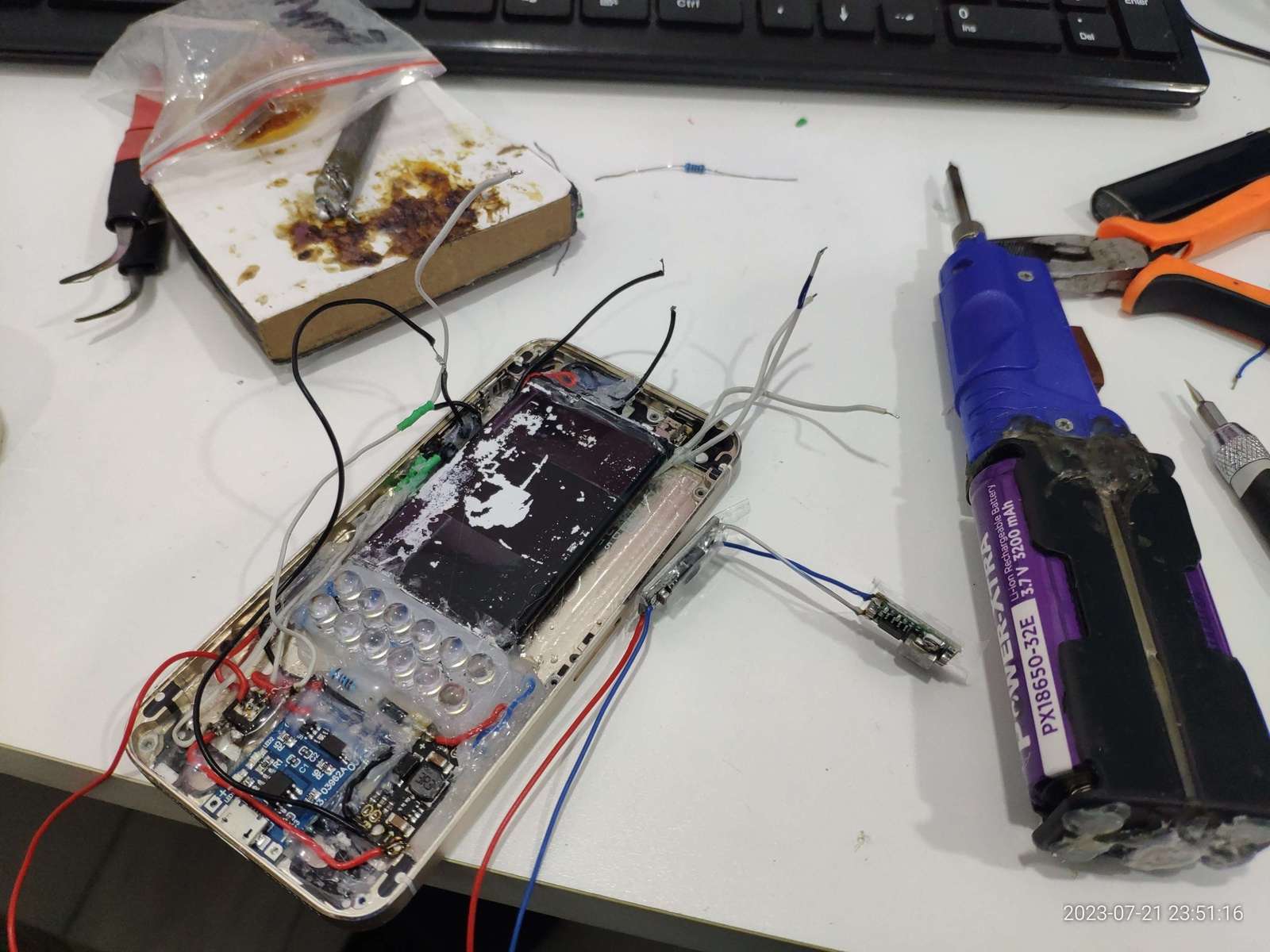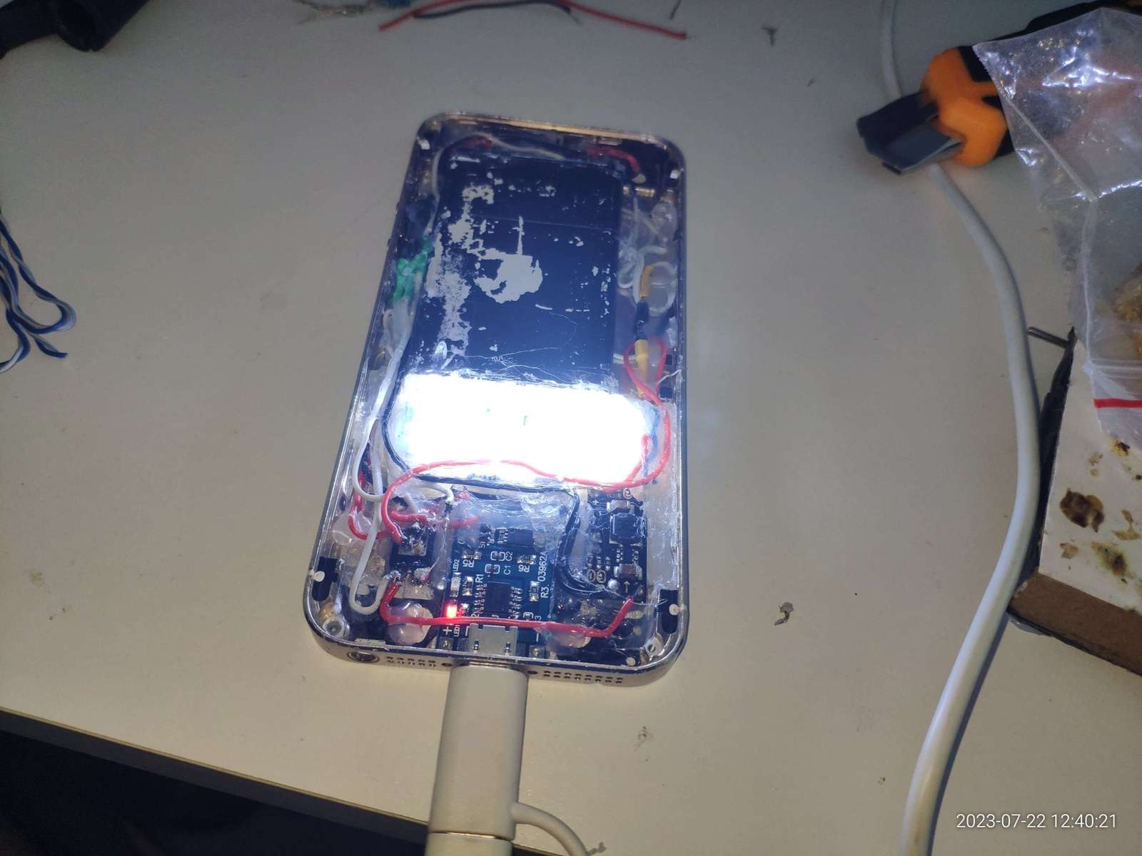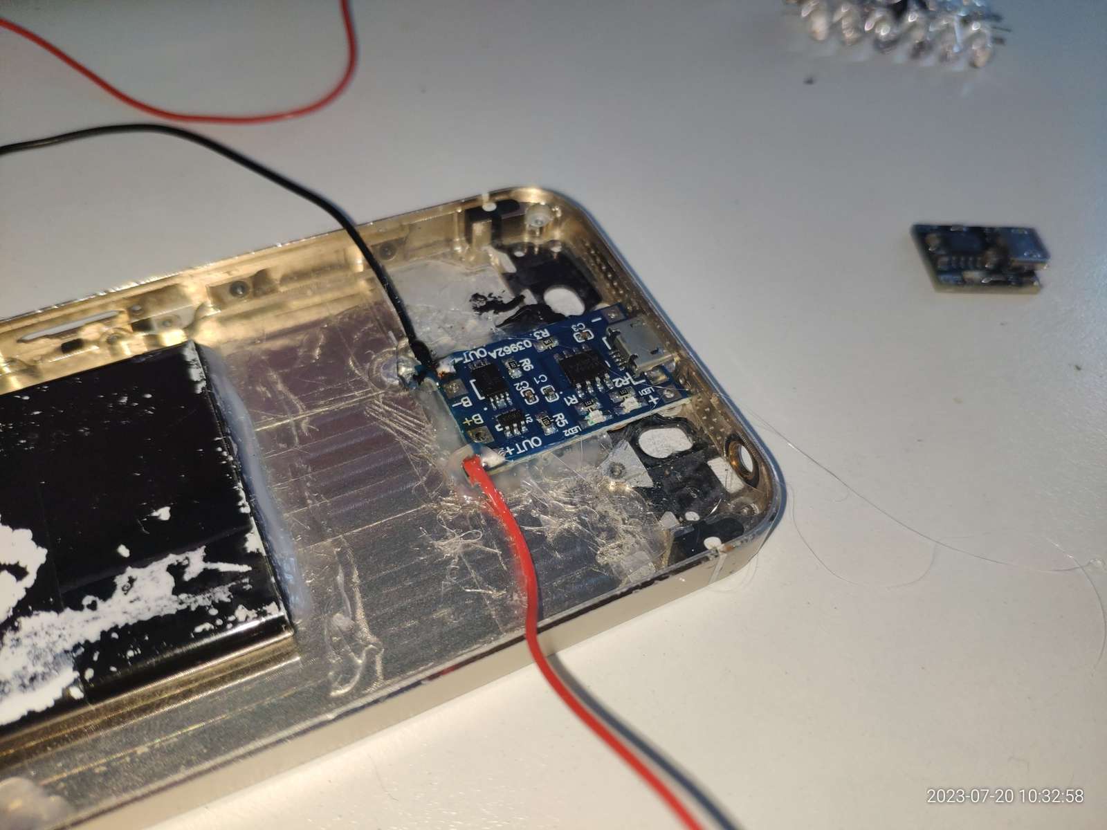 Далее мне нужно было подключить светодиоды встроенной вспышки, пытался химичить с помощью китайского понижающего модуля, но он никак не хотел работать от низкого напряжения одного аккумулятора, в итоге я другим модулем повышал напряжение, но понижающий модуль всё равно работал неадекватно, и я в итоге спалил один светодиод тёплого свечения, на этом было решено выбросить хлам из конструкции: