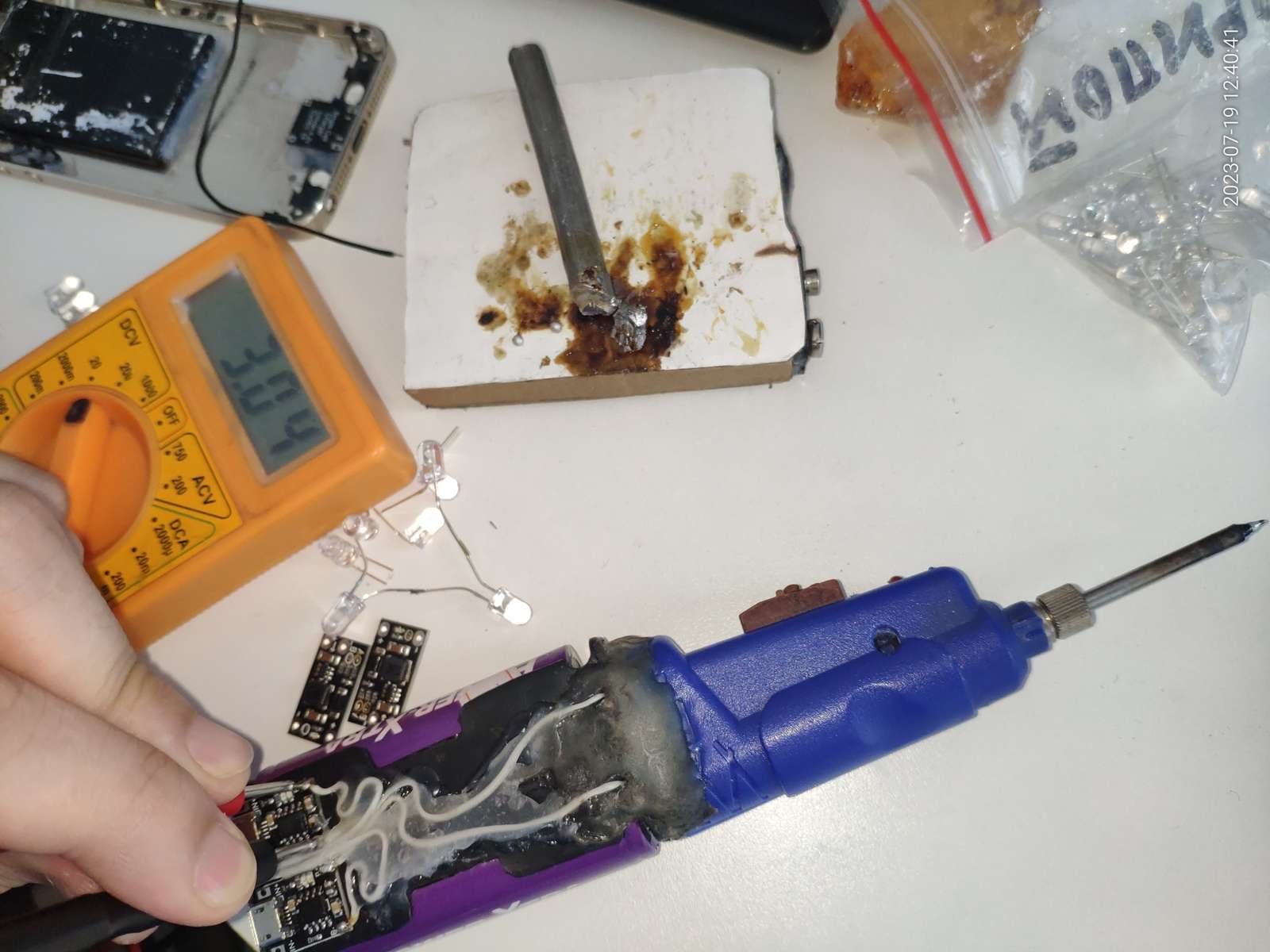 И к текущему моменту аккумуляторы в паяльнике разрядились до 3.40в, уже близко, ещё немного и наконец смогу проверить ёмкость аккумуляторов... Вообще можно было просто замкнуть аккумулятор на светодиоды и разрядить их таким образом, но это слишком просто было бы.