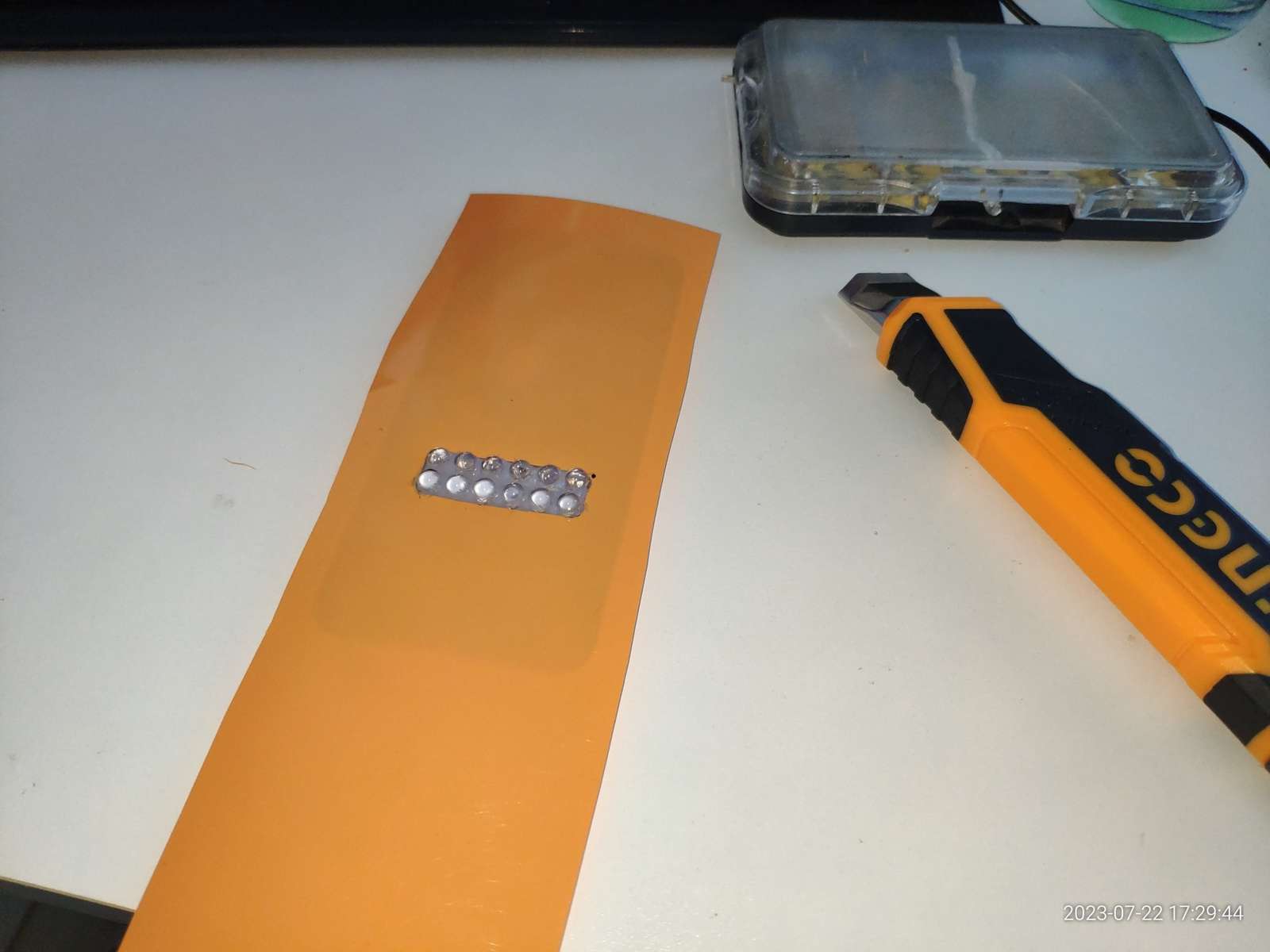 Ранее я планировал использовать два повышающих напряжение контроллера для питания светодиодов, однако решил обойтись одним, но с хорошим отводом тепла прямо на алюминиевый корпус с термопастой, я даже вырезал скотч в месте где намазал термопасту, все для максимального отвода тепла во время работы, всё же конструктивно у меня собрано на термопластичный клей, а он не любит сильный локальный нагрев: