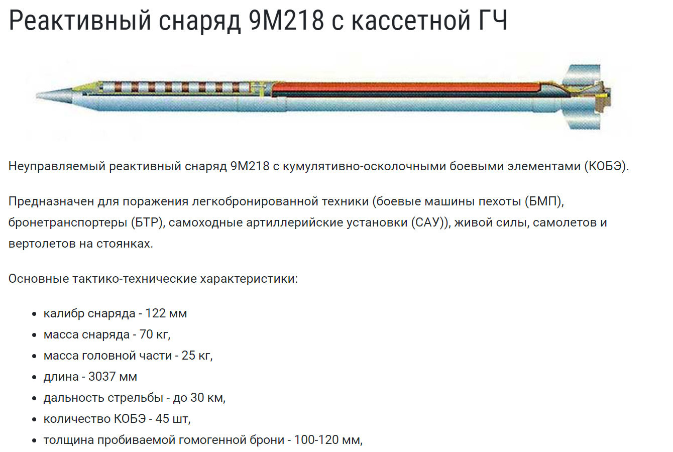 На вооружении ВС РФ имеется широкий спектр реактивных снарядов с кассетной боевой частью. 122-мм 9М218 для РСЗО «Град» поражает кумулятивно-осколочными боевыми элементами (КОБЭ) живую силу легкобронированную технику, САУ, вертолеты и самолеты на стоянках на расстоянии до 30 км. В одном снаряде 45 КОБЭ, а в одном залпе – 1800. Пробивает броню до 120 мм.