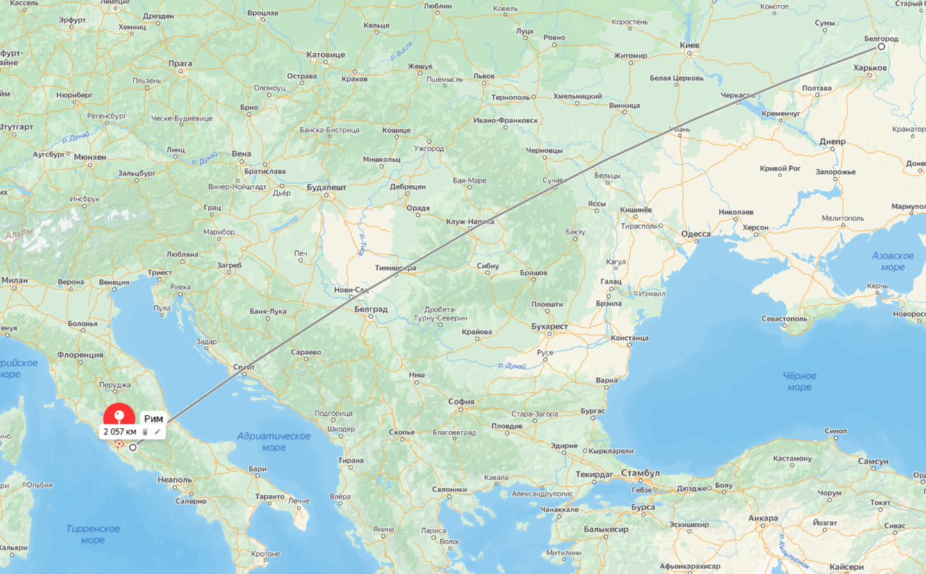 Расстояние от Белгорода до Рима чуть больше 2000 км