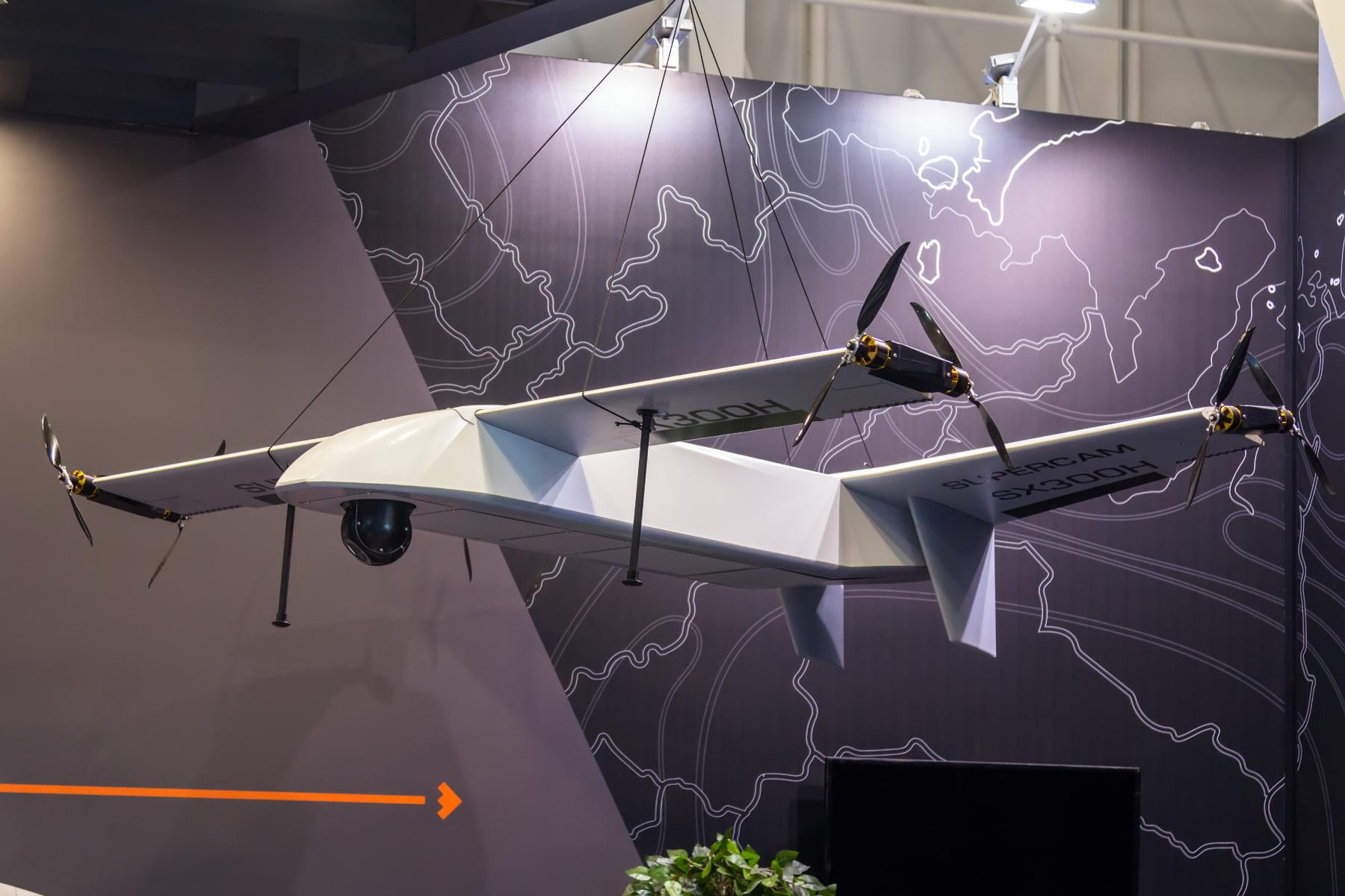 На выставке представлено множество беспилотных летательных аппаратов десятков компаний-производителей. Один из них - разведывательный беспилотник Supercam SX300H компании Unmanned Systems Group. Беспилотник сочетает в себе преимущества самолетов и коптеров вертолетного типа. Так, БПЛА может зависать в воздухе, а затем быстро менять положение и лететь как самолет. Как сообщается, "Суперкамеры" уже прошли испытания на передовой.