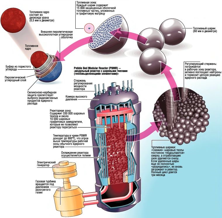 В каждой сфере находится 12 000 - 15 000 частиц топлива диаметром один миллиметр. Внутри частицы - крошечное топливное ядро, покрытое четырьмя слоями графита. По словам операторов АЭС, это решение призвано обеспечить защиту от плавления.