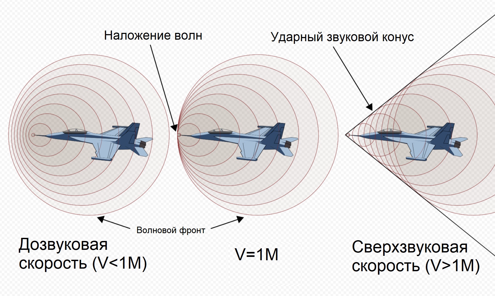 Переход на сверхзвук не заметить трудно. При этом возникает конус, в котором давление изменяется скачкообразно, на земле это слышно, как громкий хлопок. При скорости больше 1М угол этого конуса равен 45°, при 2М он сжимается до 30°, при 3М – примерно до 20°, а при 5М – до 11,5°, приближаясь к летательному аппарату. При этом быстро растет сопротивление воздуха, от трения об него конструкция в буквальном смысле раскаляется.