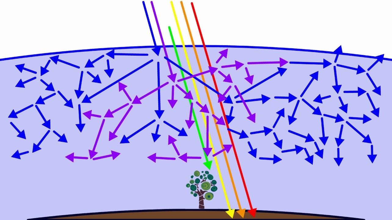 Иллюстрация рассеивания коротковолнового света (фиолетового и синего) в атмосфере