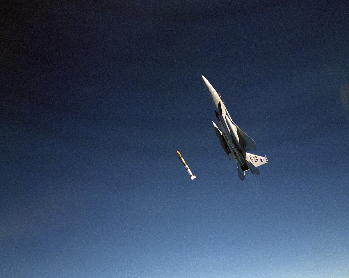 Запуск противоспутниковой ракеты ASM-135 ASAT с F-15