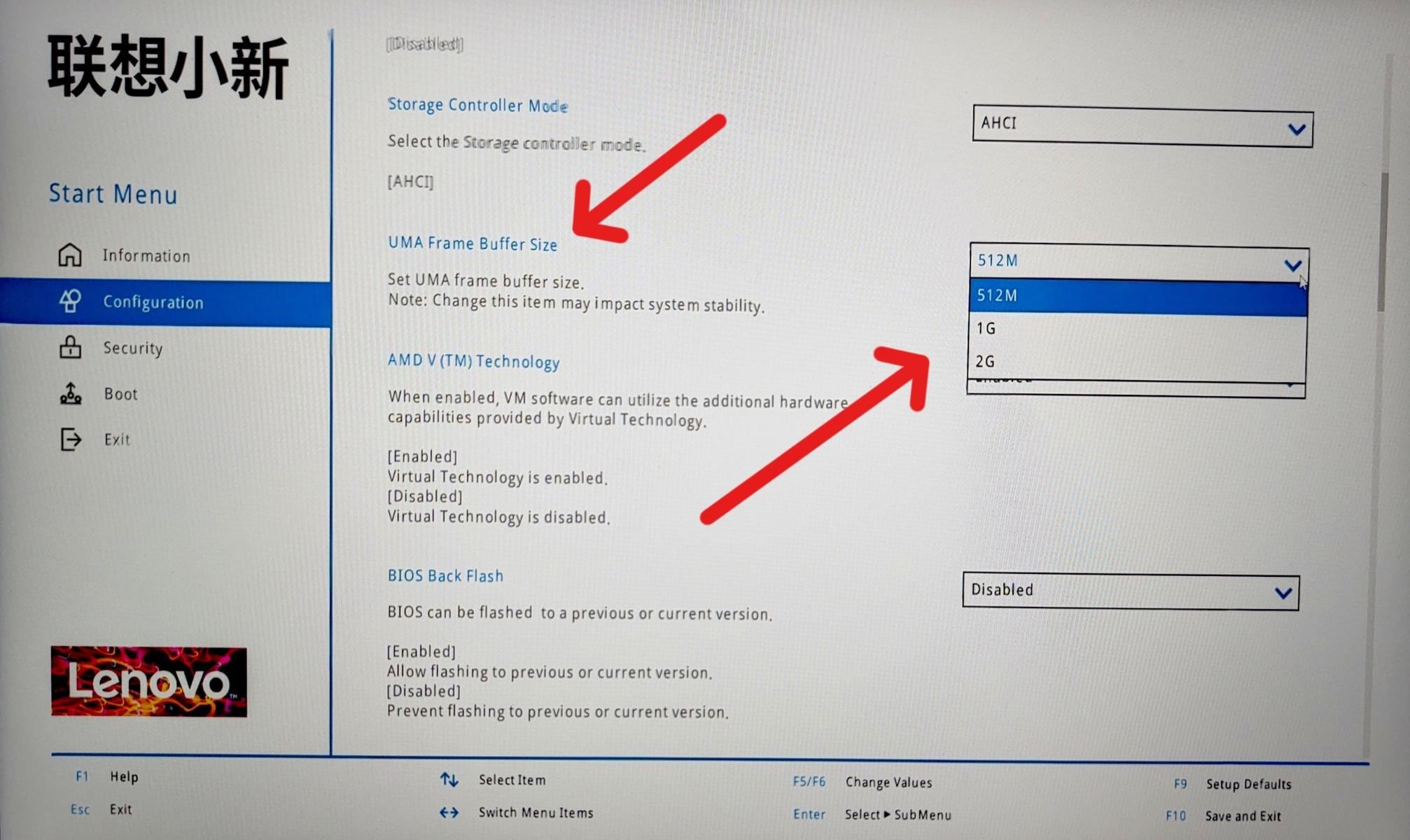 После того, как вы зашли в BIOS нужно найти пункт Configuration или Advanced (зависит от модели ноутбука). Там нам нужен параметр UMA Frame Buffer Size. В моём случае он находится здесь. Так как функции создания скриншотов у меня в биосе нет, далее будут фотографии шакального качества (на самом деле всё читаемо).