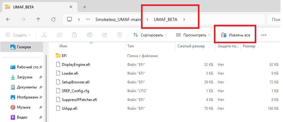 Открываем архив с помощью WinRAR, 7-ZIP или любого другого архиватора. (В Win11 можно это делать напрямую, может быть и в Win10 тоже). В архиве будет несколько файлов и папок. Нам нужна папка с названием UMAF_BETA. Открываем её и извлекаем содержимое в любое удобное место. Эти файлы понадобятся нам чуть позже.