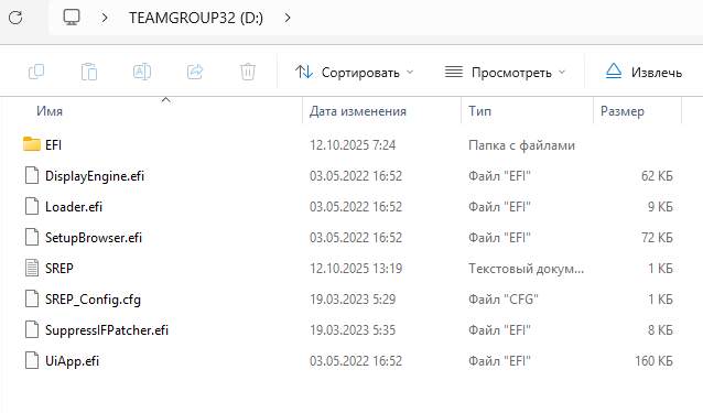 После того, как флэшка отформатирована перекидываем на неё содержимое папки UMAF_BETA. Именно содержимое, саму папку перекидывать не нужно. Таким образом у вас должно получится что-то подобное, только без текстового файла SREP.