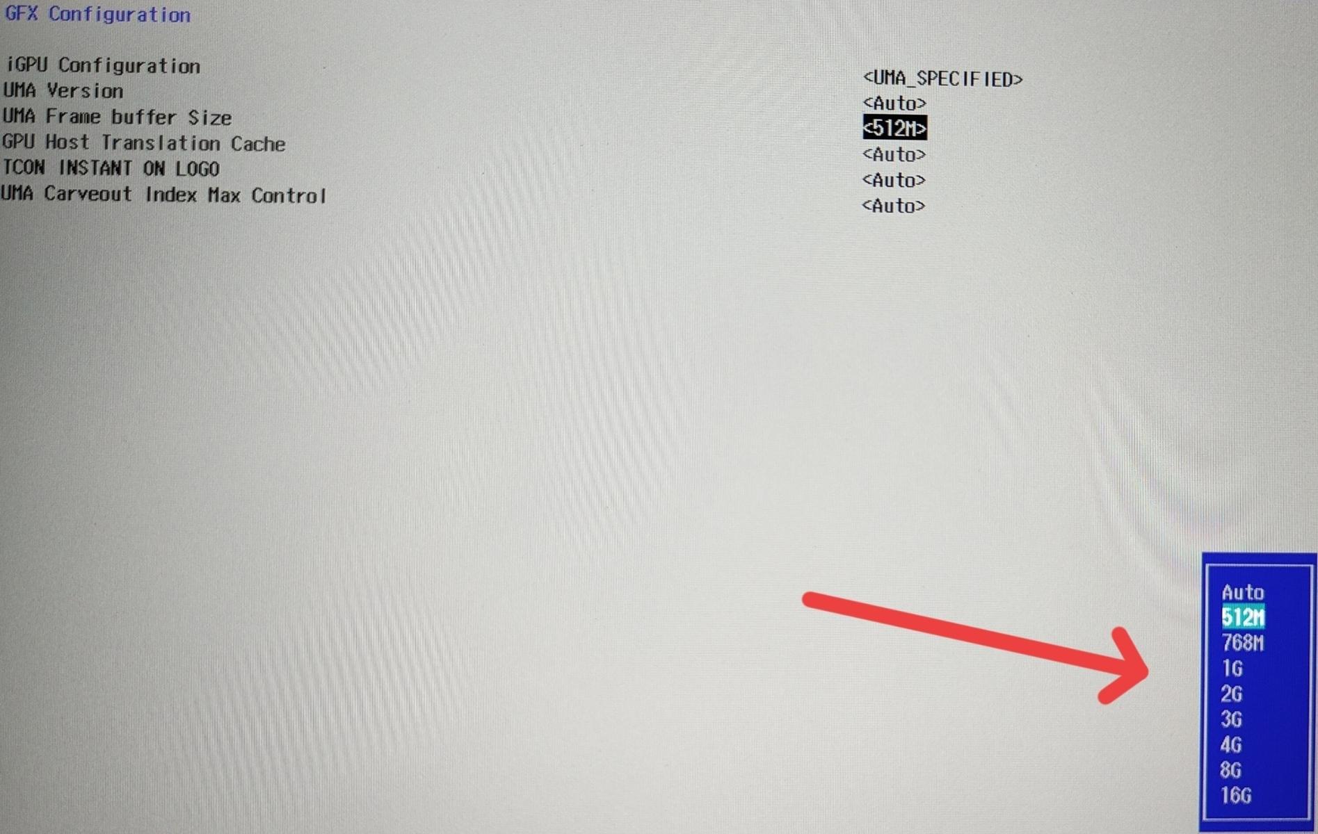 Находим пункт iGPU Configuration и переводим его со значения Auto на UMA_SPECIFIED.