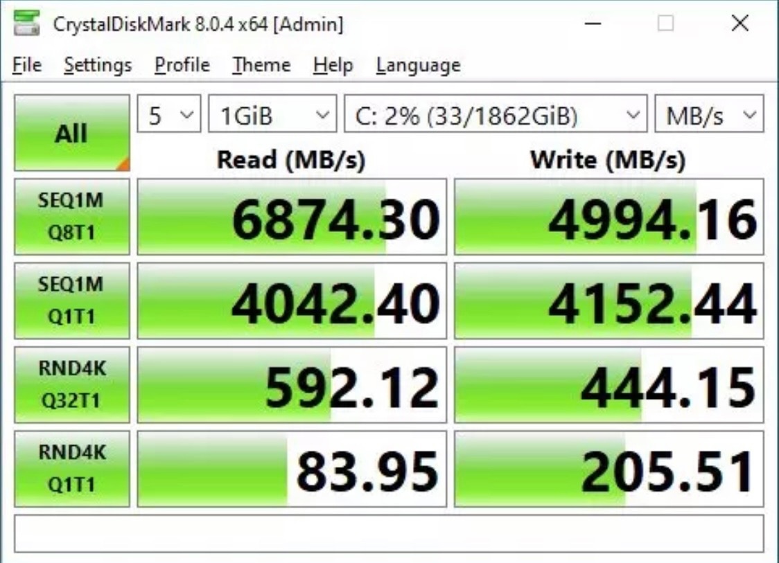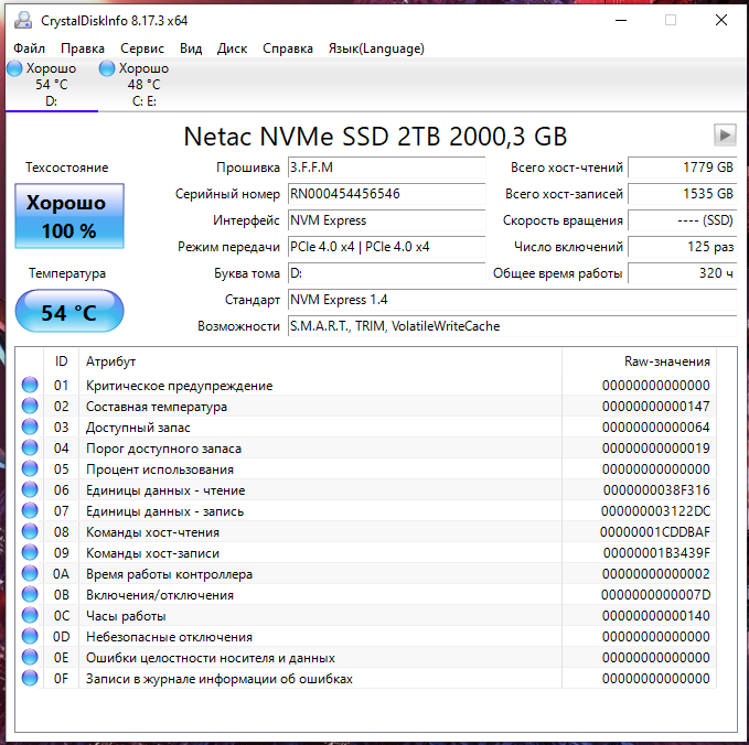 Производитель указывает в характеристиках максимальную устойчивую скорость последовательного чтения 7200 Мбайт/с, Макс. устойчивая скорость последовательной записи 6800 Мбайт/с. Ресурс записи заявлен в 1400 Тб. Мой SSD на данный момент исписал уже 1.5Тб, скрин прилагаю.