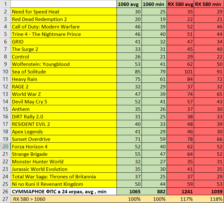 RX 588 обходит GTX 1066 на 10% и выше по минимальному либо среднему показателю в 24 играх из 70 со средним перевесом в 17% и 18% соответственно: