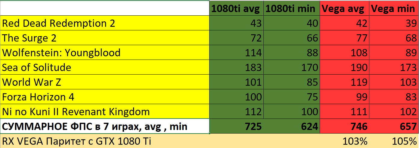 RX Vega 64 имеет паритет с GTX 1080 Ti в 7 играх из 70, со средним перевесом по среднему и минимальному показателю на 3% и 5% соответственно:
