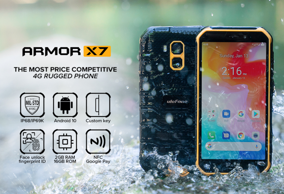 Этот смартфон Armor X7 от известной компании Ulefone оснащён 5-дюймовым дисплеем разрешением 1280 x 720 точек, 2-гигабайтной оперативкой, флеш-памятью объёмом в 16 ГБ, слотом для телефонных карт MicroSD и работает на мобильной ОС Android 10. Аккумуляторной батареи ёмкостью 4000 мАч хватит на 9-10 часов активного экранного времени.