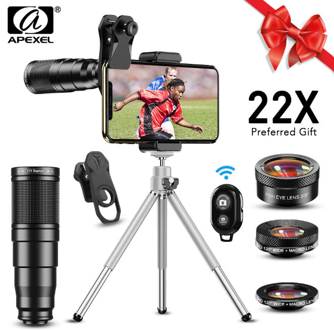 Универсальный комплект объективов APEXEL предназначен для смартфонов и подходит к любой модели. В набор входят шесть разных объективов, а также штатив для смартфона и пульт дистанционного управления. Кроме того, в комплект входят объектив рыбий глаз, широкоугольный и макро-объектив.
