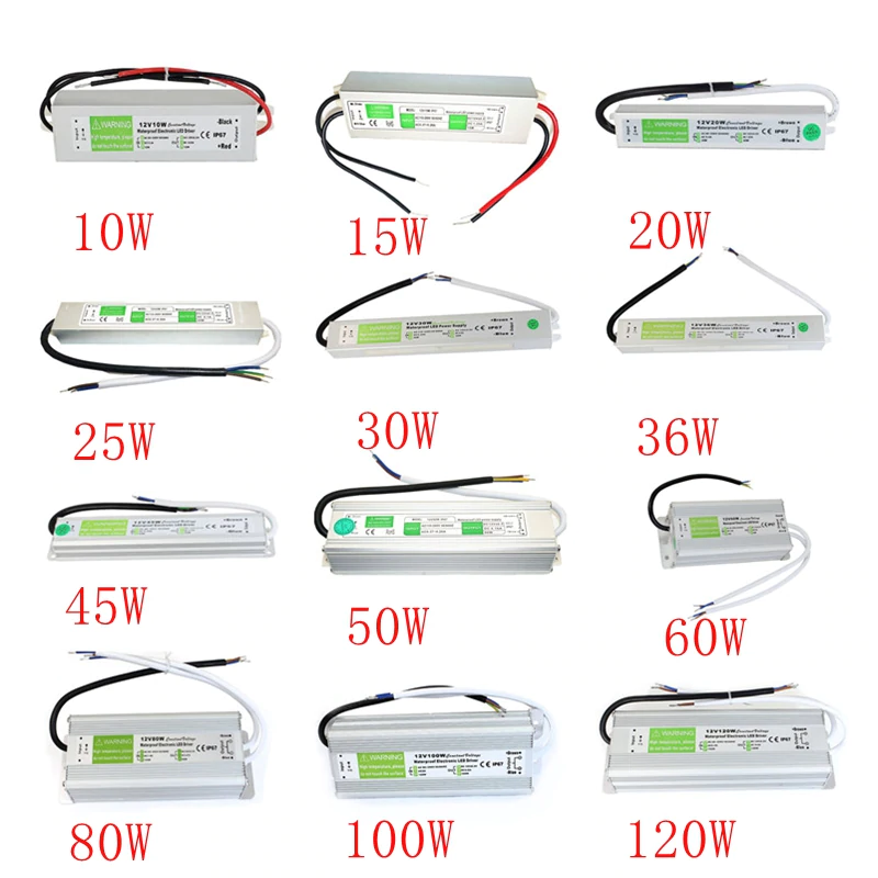 Алюминиевые трансформаторы для светодиодной ленты на 12/24 В имеют мощность от 10 до 120 Вт и подходят также для подвесных светильников, причём как внутренних, так и внешних, для чего производитель предусмотрел надёжную защиту от влаги и короткого замыкания. Подключение осуществляется через 2-жильный провод к стандартному напряжению 220 В.