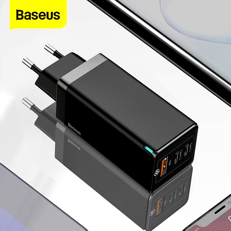 Зарядное устройство производства популярной компании Baseus имеет поддержку технологии быстрой зарядки. Для подключения устройств предусмотрены два USB-разъёма с максимальной мощностью 45 ватт и один разъём Type-C, выдающий до 65 ватт.