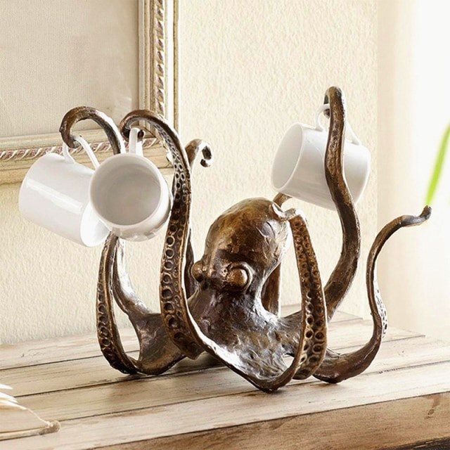 Подставка для чашек в виде осьминога с поднятыми вверх щупальцами – стильное интерьерное решение, которое прекрасно дополнит сладкий стол, сделав чаепитие по-настоящему изысканным. Для изготовления аксессуара использовался специальный смоляной состав. Размеры подставки составляют 27 х 27 х 19 см, что позволяет компактно поместить её на заставленном столе. Не вызывает нареканий и надёжность «осьминога», щупальца которого крепко удерживают хрупкий фарфор.