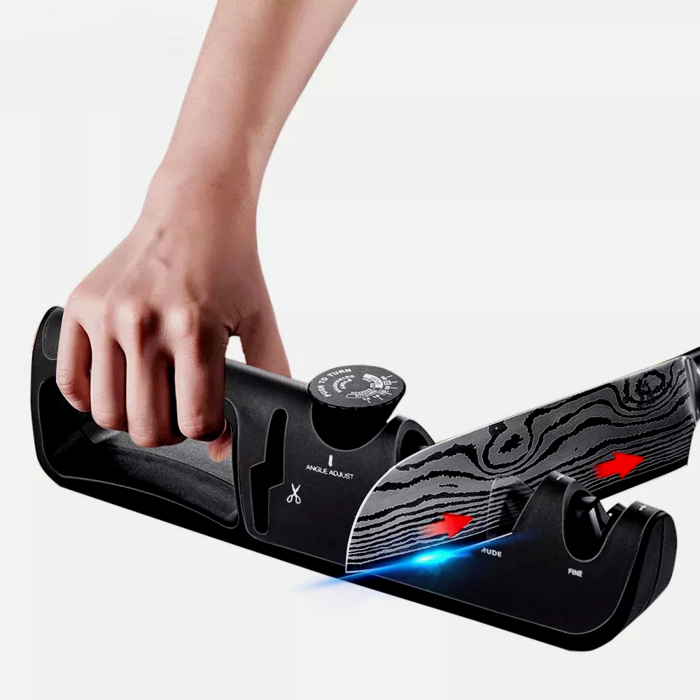 Точилка для ножей удобна в эксплуатации. Чтобы наточить нож или ножницы, нужно лишь настроить верный угол и провести лезвием 3 раза в каждой позиции. Угол регулируется посредством расположенной на корпусе кнопки. Можно затачивать лезвия любых размеров, есть специальный разъём для заточки ножниц.