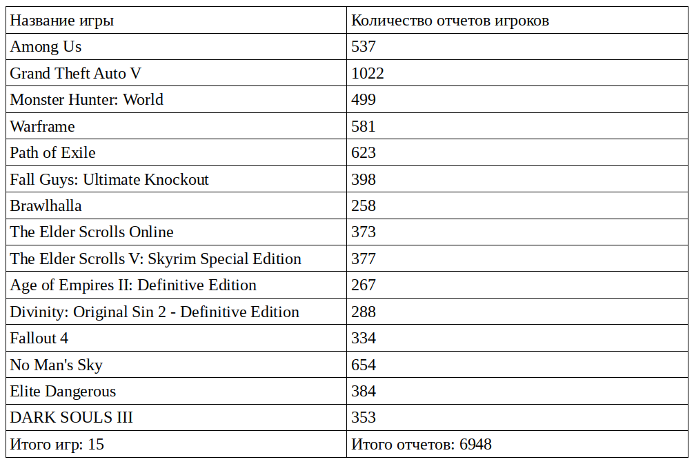 Для этого возьмем популярные игры из ТОП ProtonDB. Поскольку количество отчетов от игроков очень неравномерно, то выберем игры, где количество отчетов будет выше 200. Весь ТОП брать не будем, возьмем следующие 15 игр: