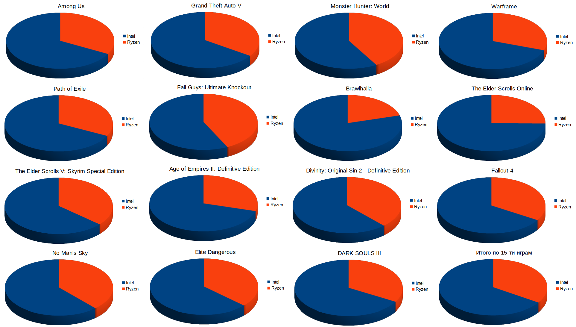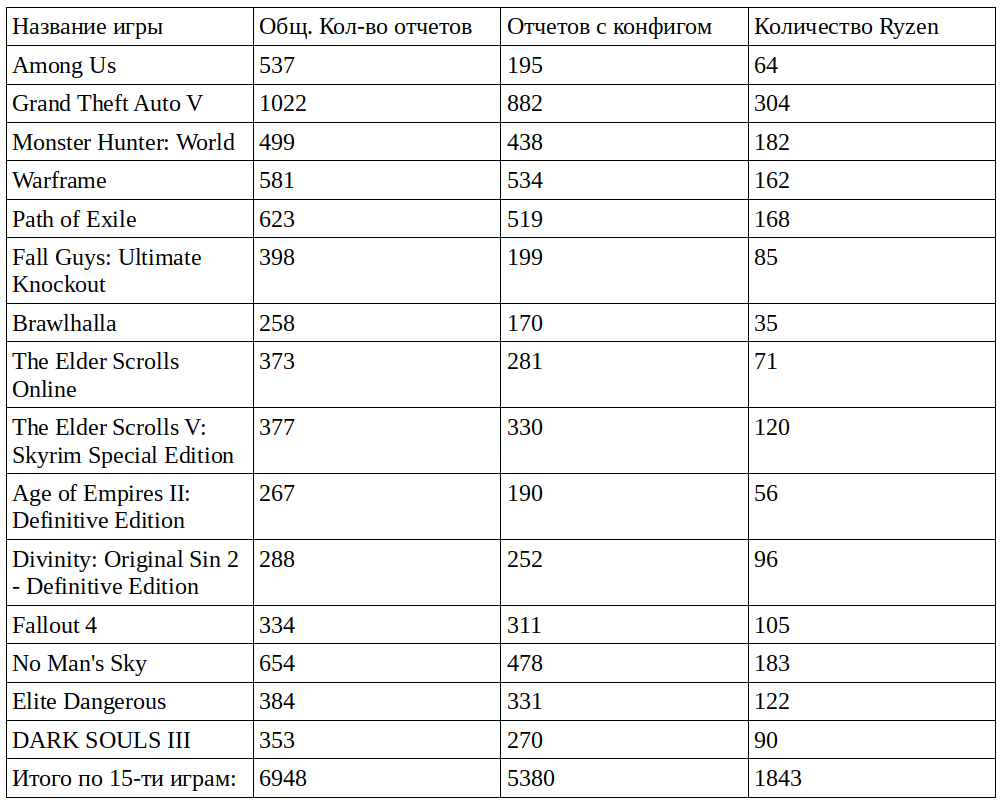 Из общей картины явно выделяется игра Brawlhalla. У нее аномально низкий процент пользователей Ryzen, хотя игра входит в ТОП.