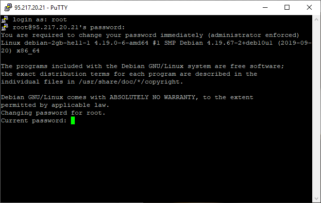 Порт оставляете стандартным (22), потом мы его изменим. Логиньтесь под root, и при первом входе вам предложат изменить пароль (вставлять текст в консоль легко правой кнопкой мыши):