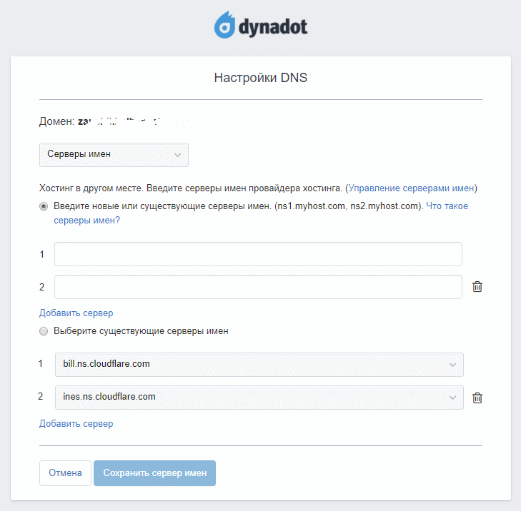 После этого Cloudflare выдаст нам неймсерверы, которые необходимо скопировать и вставить в панель управления у регистратора домена. Для этого в dynadot вам надо пройти в Управление доменами, щелкнуть на свой зарегистрированный домен, перейти в настройки DNS, нажать Управление и в выпадающем списке выбрать Серверы имен (Nameservers):