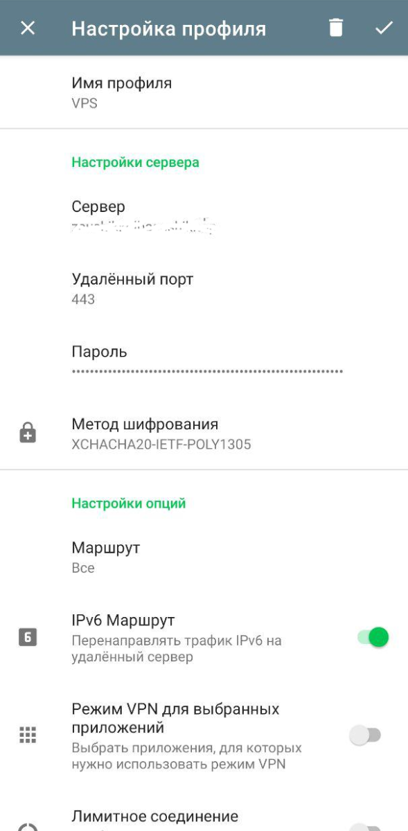 Задаем имя профиля, в раздел Сервер вписываем наш домен, который привязан к нашему VPS через Cloudflare (резолвится он соответственно будет также ip-адресом, принадлежащим CDN). Удаленный порт 443, пароль - как на сервере, метод шифрования как на сервере.