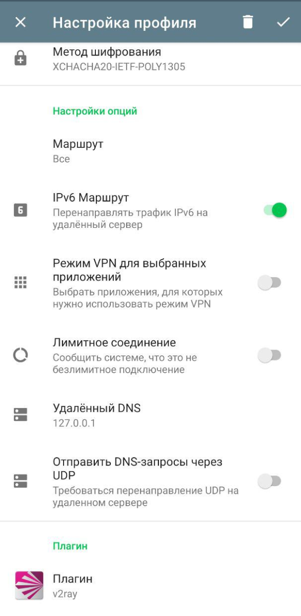 В поле Удаленный DNS указываем ссылку на поднятый на нашем сервере AdGuard, просто прописывая 127.0.0.1 (как альтернатива - можете использовать резолвер от провайдера VPS, это будет самый быстрый вариант, но не самый безопасный). Плагин выставляем v2ray и тыкаем на его настройки: