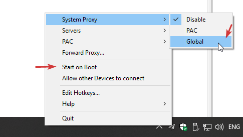 Чтобы инициировать подключение к настроенному серверу, нужно переключить системный прокси: в меню System-Proxy -> Global - это включит системный прокси вашей системы. Пункт Disable выключает проксирование, а PAC - это специальный набор правил, который может формироваться автоматически на основании подсетей китайского Интернета. Также советую, чтобы не запускать программу каждый раз при включении ПК, отметить галкой пункт Start on Boot.