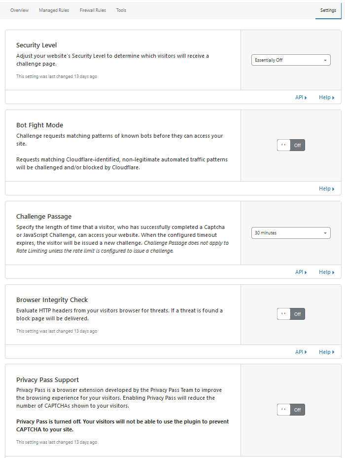 Файлы необходимо разместить на сервере в папке /etc/ssl/ и установить права на чтение (убрать права на запись). После завершения возни с сертификатом перейдите во вкладку Firewall консоли Cloudflare, раздел Settings и отключите все функции: