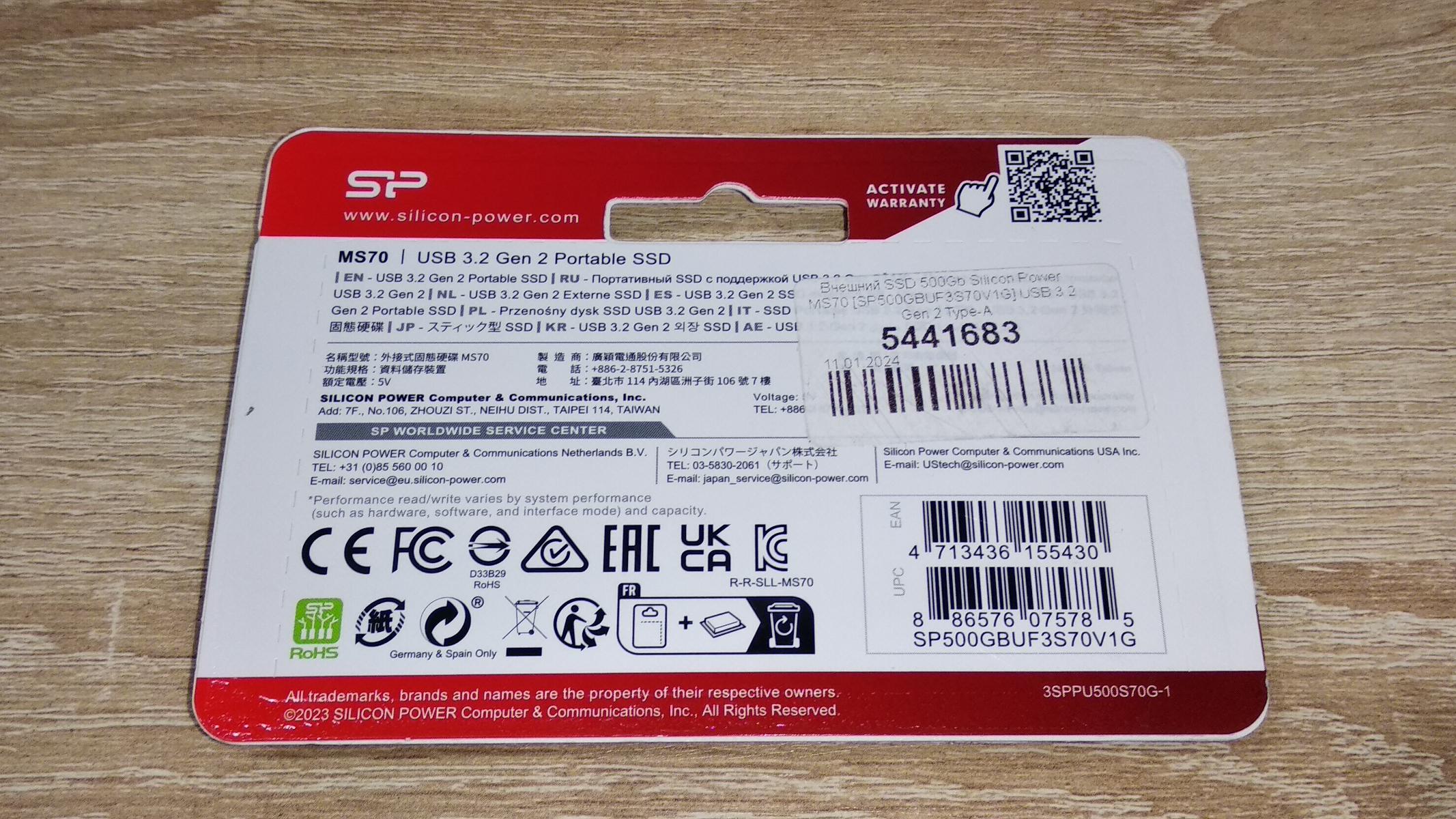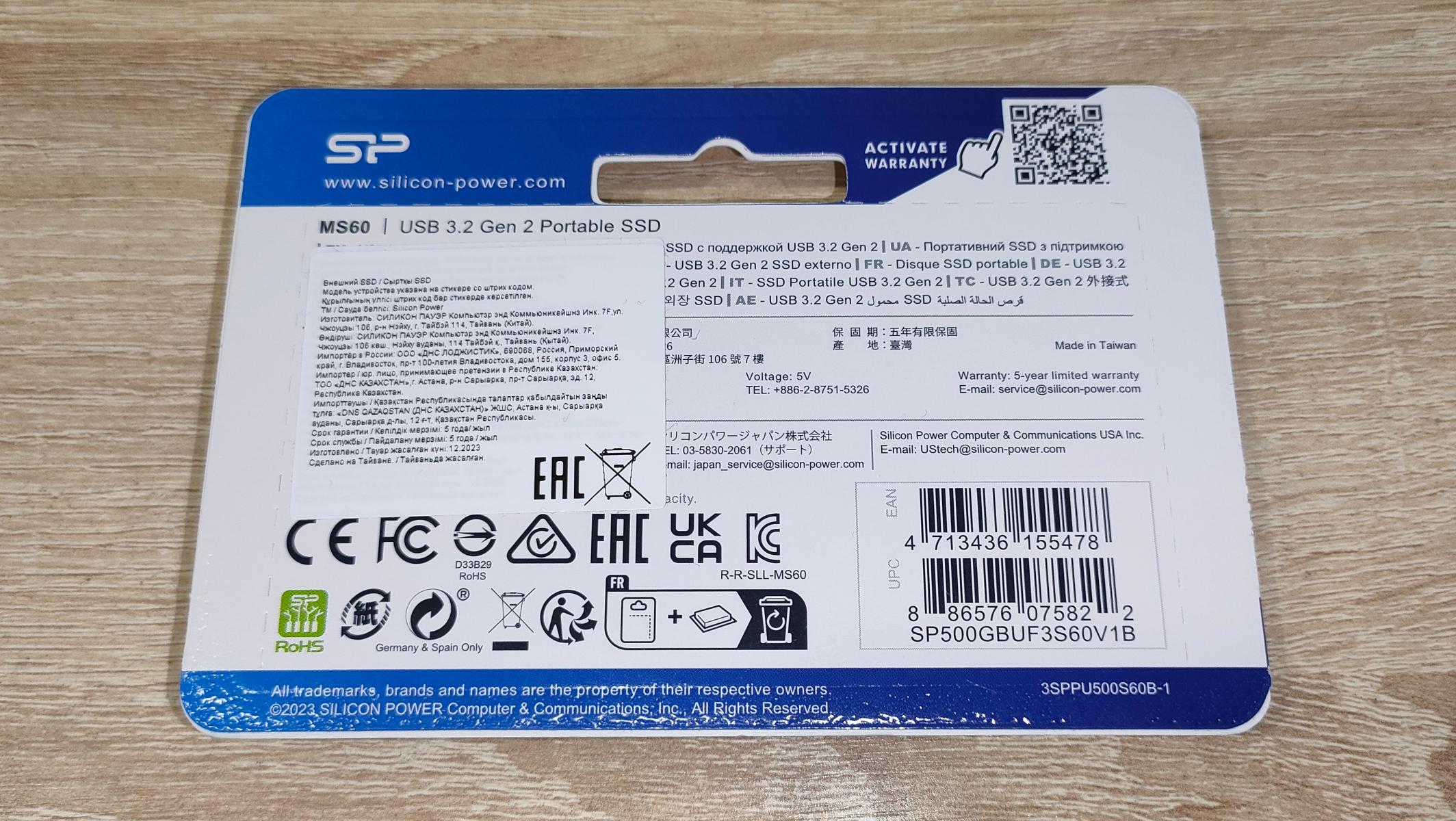 Есть наименование бренда, модели, а также, что это портативный SSD. Отличаются максимальные скорости чтения и записи: для MS70 — 1050/850 МБ/с, а для MS60 — 600/500 МБ/с. Неудивительно, что на лицевой стороне указан интерфейс USB 3.2 Gen2.