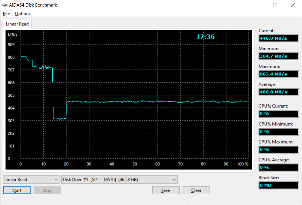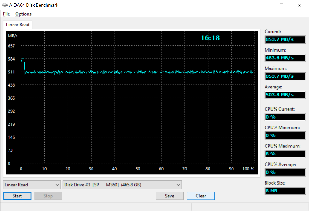 Скорости чтения пустых накопителей фактически одинаковые и держатся на уровне 850 МБ/с, что для одного накопителя сверх заявленного, а для другого не достает. Всегда стоит помнить, что скорости указываются для кэша и для максимальных по памяти вариантов. Скорости записи в пике 750 и 550 МБ/с, что примерно укладывается в ТТХ. Устоявшаяся скорость записи 120 и 90 МБ/с, что в общем-то ожидаемо для среднестатистического внешнего SSD. После записи чтение находилось на более приземленном уровне, в районе 500 МБ/с.