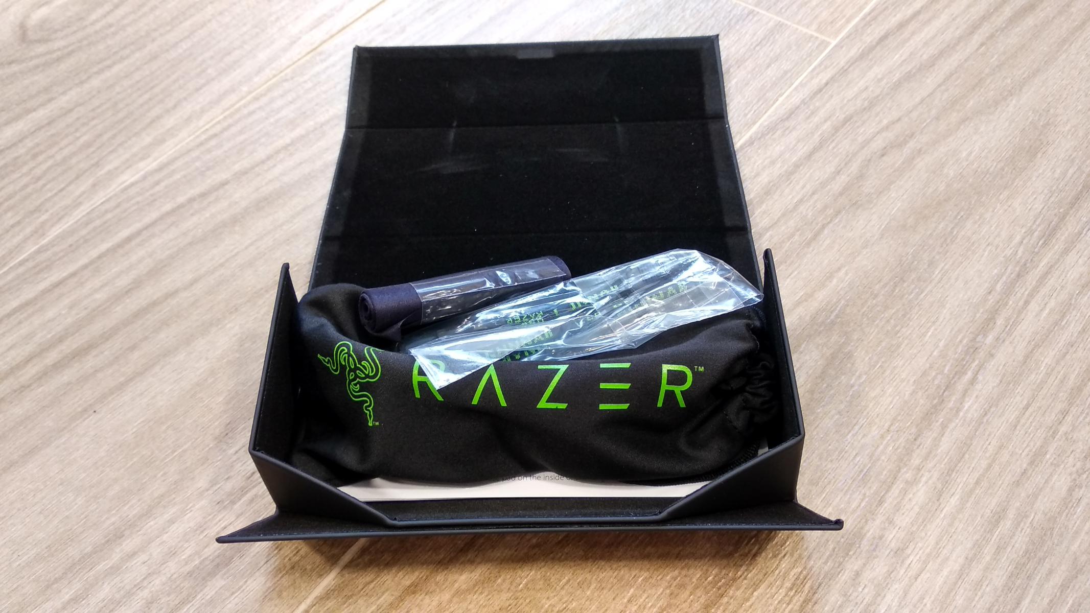 Коробочка благородная, с покрытием софттач, вполне подходящая для подарка. На ней нанесены логотипы фирм, приложивших свою руку при создании, а именно Gunnar и Razer. Если ее раскрыть, а она раскладывается почти в столик, то увидим все, что входит в комплект поставки: очки в чехле, шнурок, салфетку.