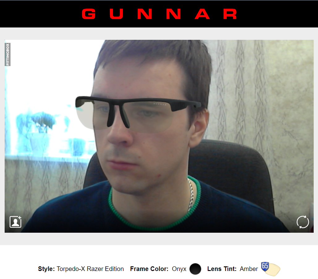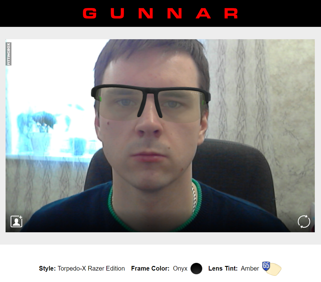 Очки сидят удобно, а благодаря небольшому весу, они не ощущаются совершенно. В них нет пробелов с боков, но таковые есть снизу, ведь высота линз небольшая. Для кого-то этот факт будет решающим, т.к. бывают люди, которые на дух не переносят такую "засветку". Для кого-то крайне важно, как человек будет выглядеть в очках и поэтому проводят большое количество времени в магазинах оптики, примеряя очки. Очки GUNNAR Torpedo-X Razer Edition можно примерить не выходя из дома, т.к. есть онлайн-примерка. Разрешаем доступ к веб-камере и можем начинать рассматривать.