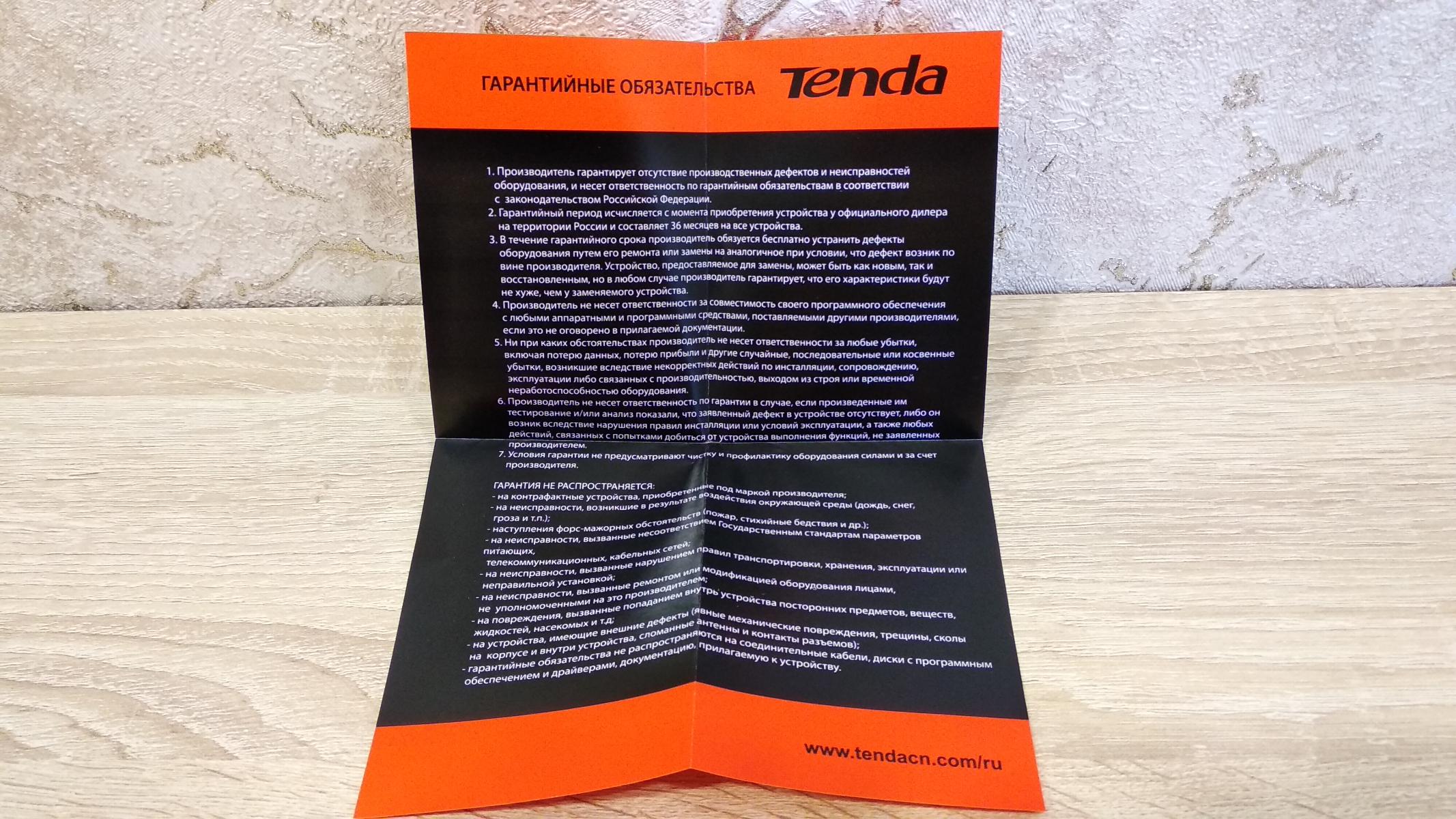 Упаковка очень компактная, изготовлена из картона. Цвет черный с оранжевыми надписями, как и большинство упаковок у Tenda.