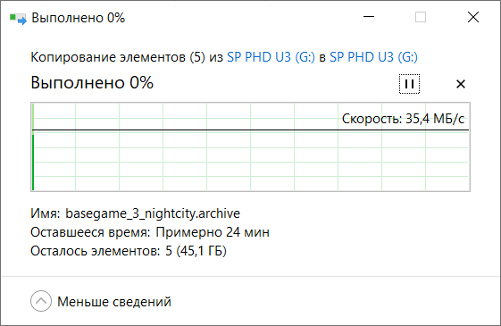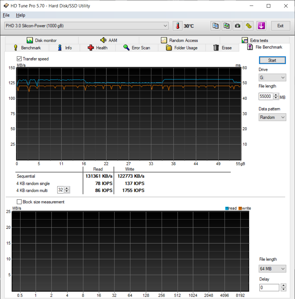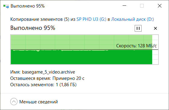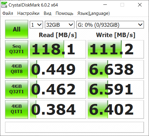 Чтение ожидаемо выше, ближе к 130 МБ/с, что тоже средний показатель для подобного уровня накопителей.