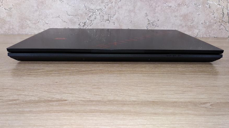 На крышке ноутбука есть логотипы компании, которые правильно ориентированы, когда ноутбук открыт. Размеры типичные для 15.6 дюймовой модели, только он заметно толще, как и большинство игровых моделей, 25 мм спереди и 30 мм сзади с ножками. Дизайн тоже типично игровой — агрессивные рубленные.
