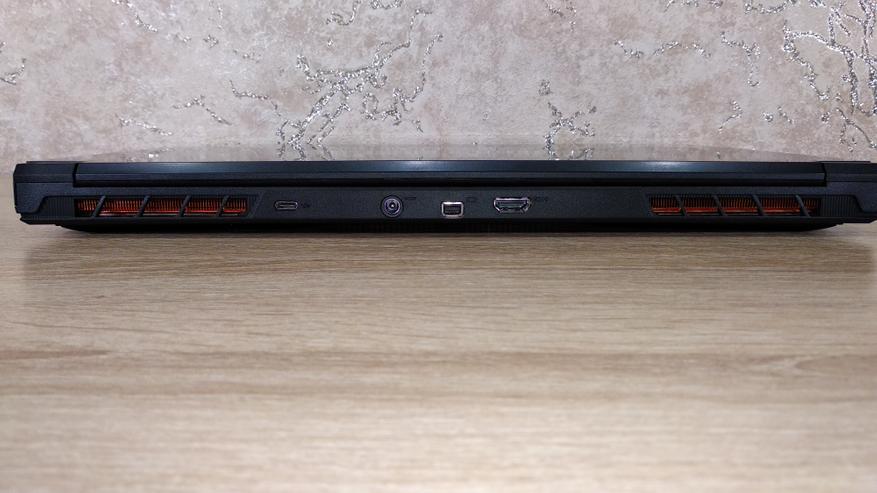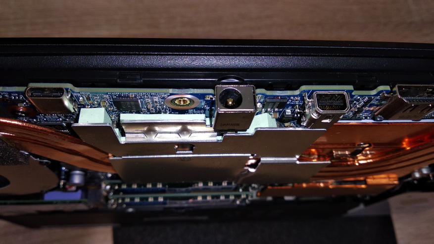 Передний торец пустой, на нем есть только три стандартных светодиода. Слева видны раздельные разъемы 3.5 мм миниджек для микрофона и наушников, USB 2.0, USB 3.2 Gen2 и замок кенсингтона, возле них есть первый радиатор. Сзади тоже есть разъемы, благо толщина позволяет. Здесь есть USB Type-C (USB 3.2 Gen2), разъем питания 5.5*2.1, miniDP и полноразмерный HDMI. По бокам от разъемов есть еще два радиатора, которые сияют чистой медью. Правый торец имеет еще один USB 3.2 gen2 порт, разъем гигабитной сети, а также 4-й радиатор.
