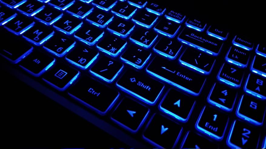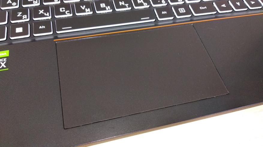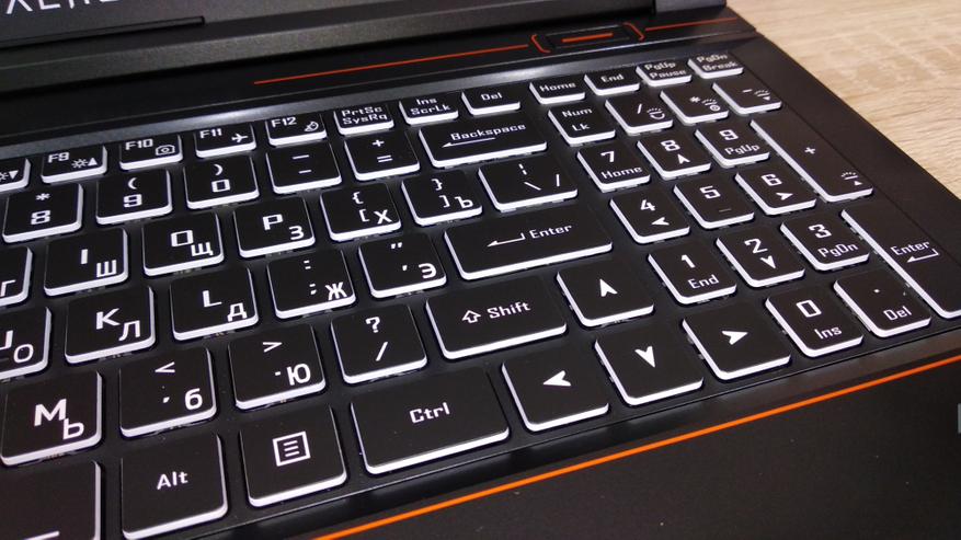 В меру легкие петли и увесистое основание позволят открыть ноутбук одной рукой, без открыва от стола. Первой в глаза бросается полноразмерная клавиатура с цифровым блоком, а также кириллицей, за которую всегда ругали китайские ноутбуки. Шрифт основных сиволов изображен белым и хорошо читаем даже в сумерках. Над клавиатурой, как и под ней, есть пара оранжевых полосок, как и логотип на крышке. Кнопка включения и отключения, расположена в правом верхнем углу, возле клавиатуры.