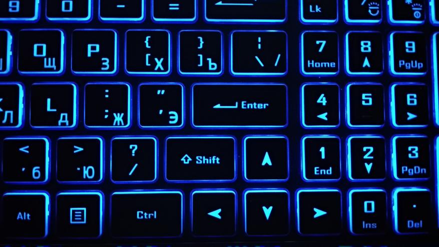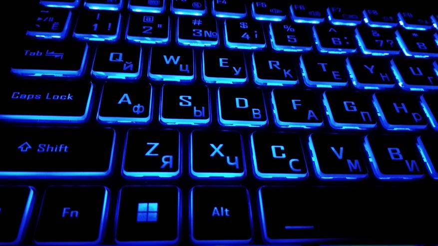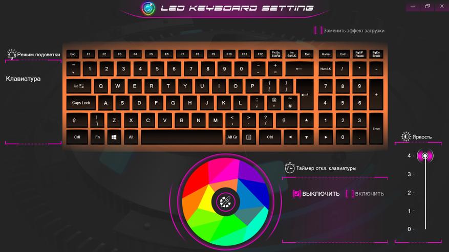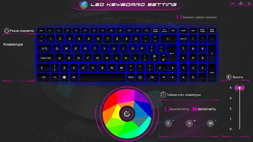 О клавиатуре достаточно сказано при внешнем осмотре. После включения она начинает светится. Время до сна, яркость и увет без проблем настраивается в официальном ПО. О нем будет рассказано отдельно. Самое главное — можно выбрать спокойный цвет подсветки, яркость и выключить сон.