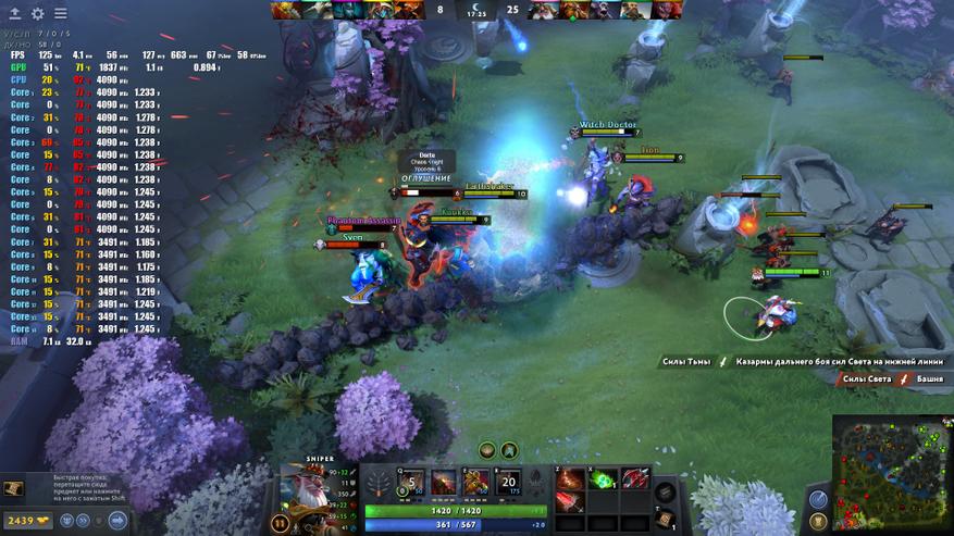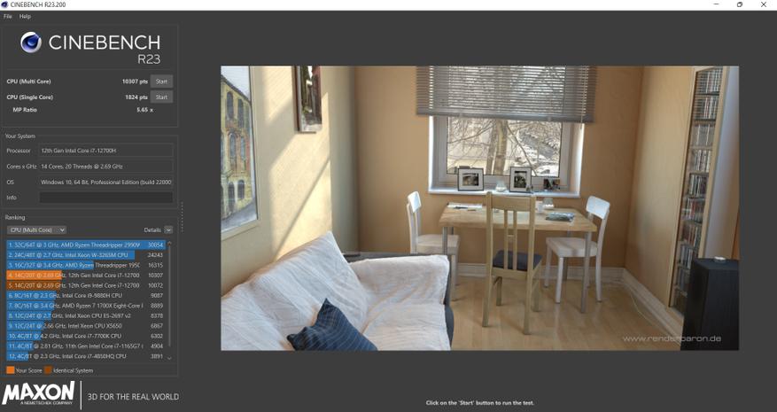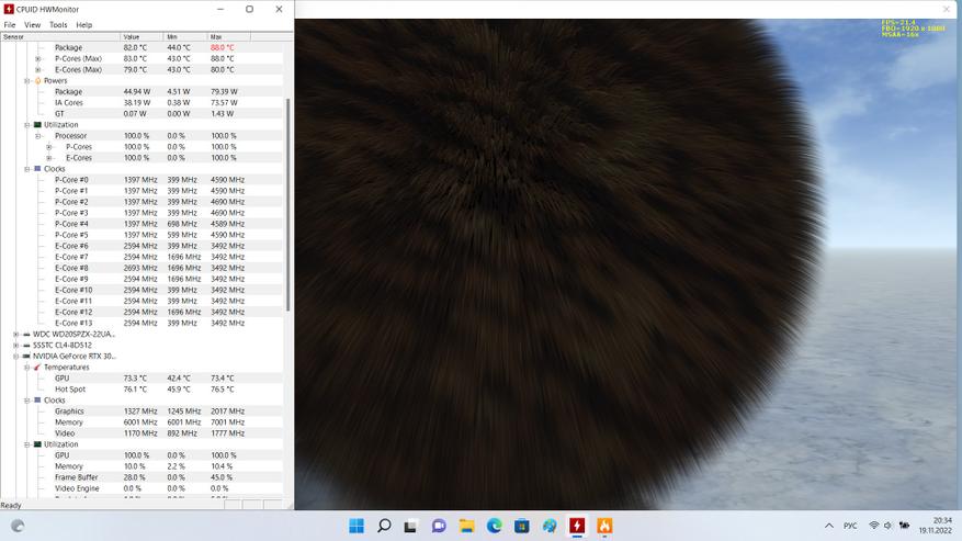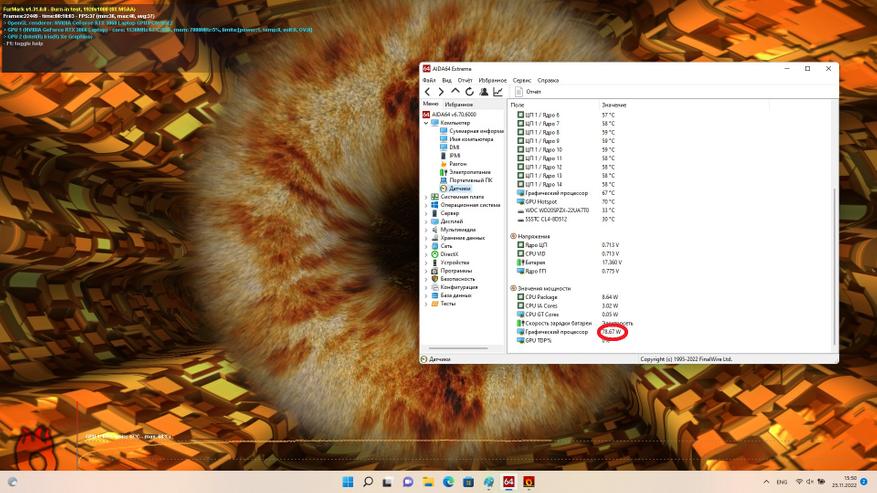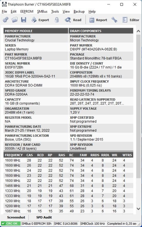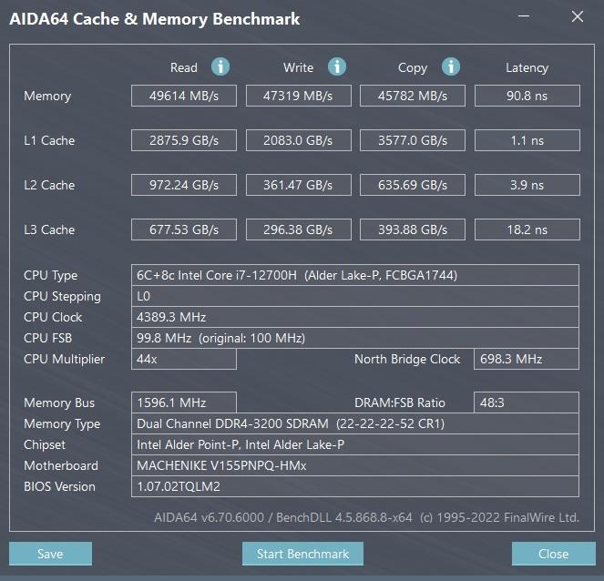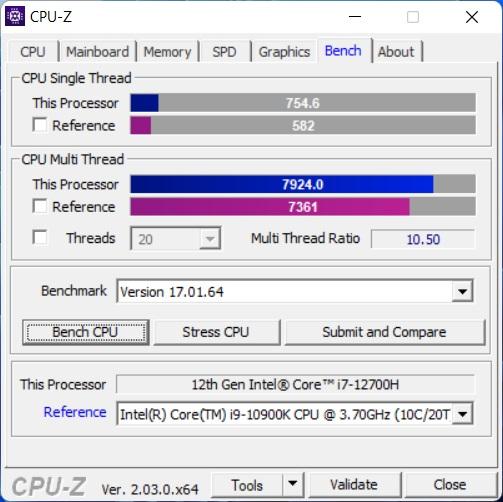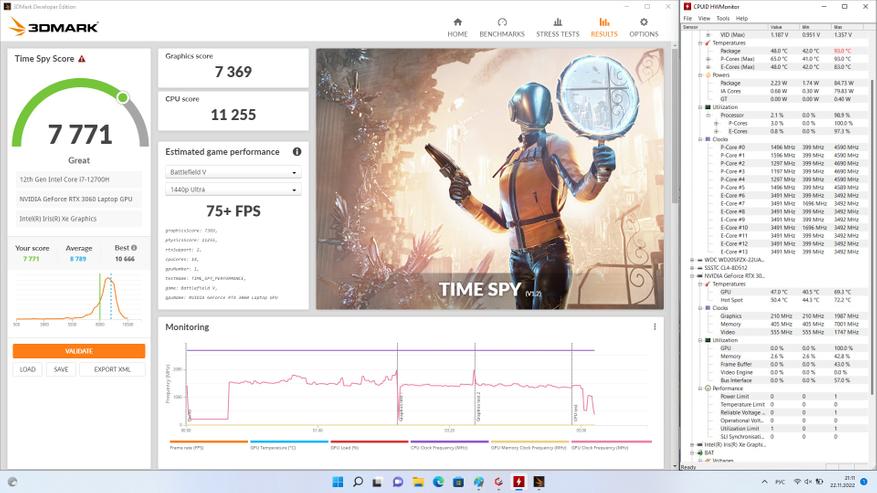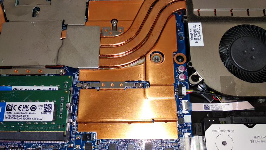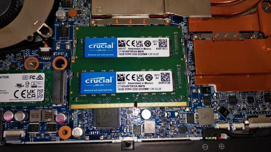 В основе ноутбука лежит Intel i7-12700H — это процессор с 6 производительными P-ядрами с поддержкой HT, работая на частотах до 4.7 ГГц и 8 E-энергоэффективными с частотой до 3.5 ГГц. Теплопакет у процессора 45 Вт, ему разрешено буститься до 115 Вт, в режиме турбо, в зависимости от температуры и зашитых производителем значений. В папу ему установлено 32 ГБ ОЗУ DDR4, производства Crucial (CT16G4SFS832A.M8FB) в двухканальном режиме и частотой 3200 МГц CL22. Производительность связки на высоте, позволяя без проблем заниматься видео и фото монтажом, т.к. объем памяти немалый, а процессор позволит не ждать часами. Жаль, что нет возможности управления частотой и таймингами памяти, даже 3400CL16-18 дало бы ещё 5-7% производительности на ровном месте.