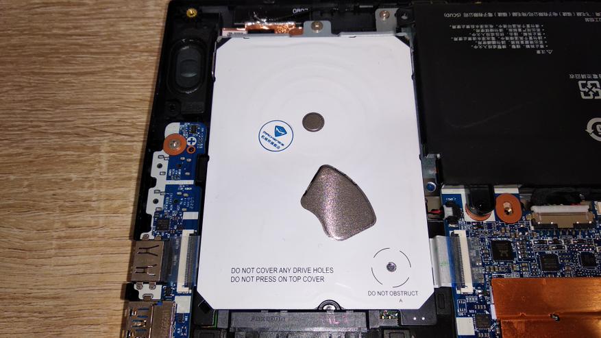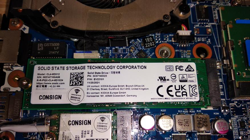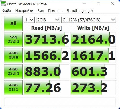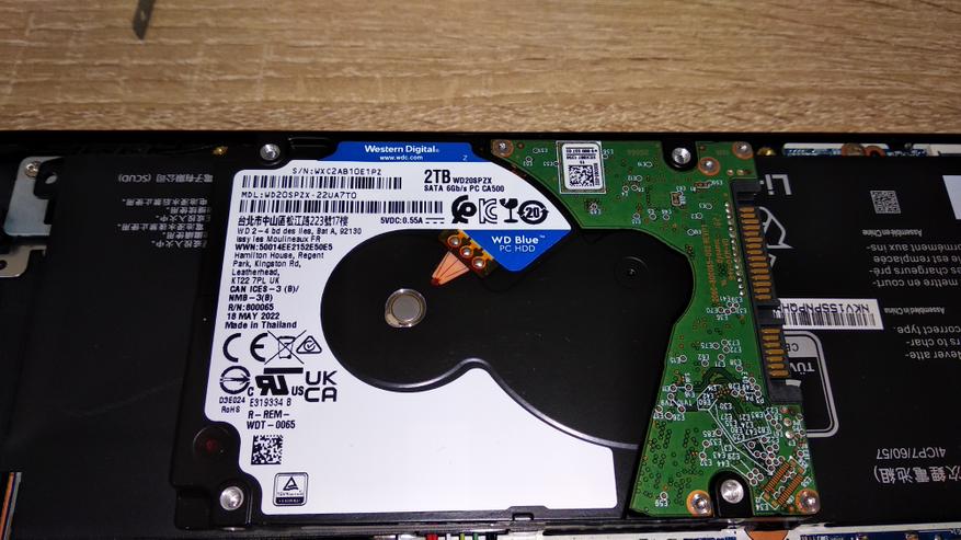 В моем варианте ноутбука установлена связка из NVME накопителя SSSTC SC4-8D512 (KIOXIA) объемом 512 ГБ, а также классического жесткого диска WD Blue (WD20SPZX) на 2 ТБ. Они (жёсткие диски) уже немного странно выглядят в ноутбуках, добавляя лишний шум и вибрацию, а также делает ноутбук более нежным к сотрясениям Было бы логичнее установить SATA SSD на те же 2 терабайта с DRAM кэшем (а то и без). Тем более нынешние цены позволяют. Впрочем, ничего не мешает так сделать пользователю, а оставшийся HDD поместить в USB карман и получить внешний накопитель на 2 ТБ. Контроллер в SSD используется SM2267XT, как известно он DRAMless, т.е. безбуферный. Скоростные показатели типичны для PCIe 4 накопителя с данным контроллером (недалеко ушел от PCIe 3) и жесткого диска.