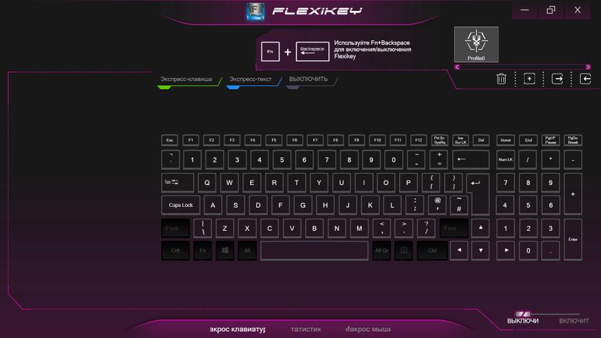 Утилита позволяет настроить подсветку в одном из 15 вариантов, настроить яркость и таймер отключения. Не забыта и возможность создание макросов. Управление вентиляторами позволяет использовать три режима: максимальный, автоматический и ручная настройка кривой оборотов вентилятора, причем для CPU и GPU раздельно. И последним пунктом идет настройка профиля энергопитания. Если честно, я не нашел между ними принципиальной разницы. Ниже я приведу скриншоты, в подписи которых будет показано, что и где.